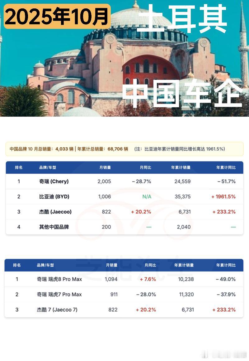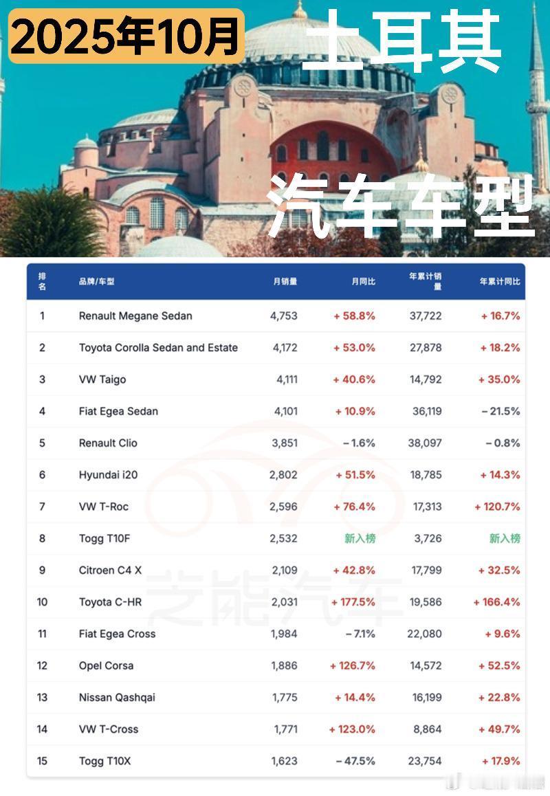 2025 年 10 月土耳其车市销量同比增长,前十月累计销量突破百万,中东增长核心地位凸显。大众强势回归品牌榜首,丰田同比大增成最大赢家之一,雷诺、本土品牌 Togg 等同步发力。中国品牌里比亚迪有累计销量支撑,奇瑞部分车型表现亮眼,杰酷 7 也有增长,个别品牌月销略有波动。车型榜黑马频出,新款本土车型上市不久就跻身前十,市场竞争挺有看点~