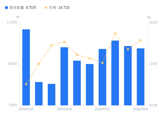 日期A股户数(户)流通A股户均持股数(股)户均持股市值(万元)2025-10-319753816281.6723.952025-09-309869016091.6122.622025-08-3110128415679.4923.852025-07-319725116329.7121.342025-06-308995717653.7823.672025-05-319159617340.5523.702025-04-309806316196.9923.652025-03-318035019767.5828.352025-02-288125819546.7025.432025-01-3110670014885.9017.16