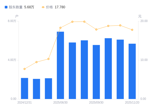 近一年(2024年12月31日至2025年11月20日),利民股份A股股东户数从2.16万户,增加至5.68万户,增幅163.23%,区间股价上涨124.13%。
