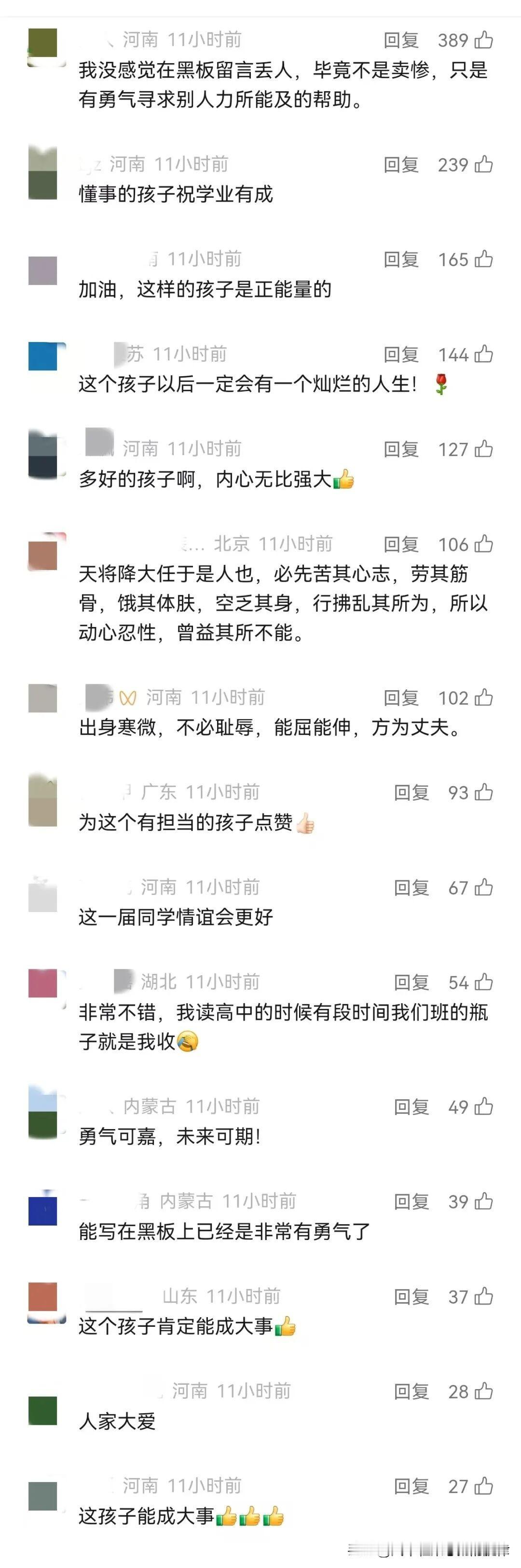 高二学生黑板留言“收废瓶”,帮家里撑腰,学校暖心回应设专用收集箱! 当“帮妈妈挣医药费,帮爸爸还债”的留言出现在教室黑板上,不少人心头一紧,也被这份毅力和责任感深深打动。这位来自安徽淮南第五中学的高二学生,用最朴实的方式——收废瓶,挑起家中重担。背后是十万余元的农田欠款,是妈妈的医药费,这是一个平凡少年挺起的家庭脊梁。 一张简单的黑板留言,传递出的不仅是求助,更是一种拼搏和担当。为了方便这位学生,学校体贴地在每个班级专门设置了废瓶收集容器,小小的举动,见证了校园大家庭的温度。 网友们为他点赞:“这份勇气和责任感,才是真正的成长!”“如果是我班,我也会贡献一份力量的。”生活的磨难没有击倒他,反而激发更多人的关怀和温暖。 这则故事告诉我们:青春不仅是书本和考试,更是面对现实时的坚强和担当。比起嘴上的“加油”,更有意义的是伸出实际的援手,汇聚爱的能量。也提醒我们,关爱不是一句口号,而是从身边每一个细节做起。 你是否也被这份勤劳和勇敢感动?身边有需要帮助的人你会怎么做? 热点 欢迎下方留言,带上你的故事和感受,让我们一起温暖更多人!