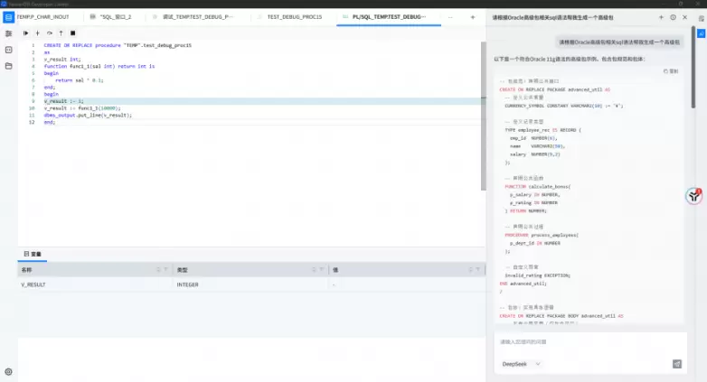 崖山开发者工具(YDC):V23.5推出AI助手,支持配置DeepSeek、混元、通义千问等主流大模型引擎,实现自然语言与SQL的双向转换、智能建表及测试数据生成,显著降低SQL开发门槛;同时,PL/SQL调试能力全面增强,优化了变量与断点管理,并支持调试状态持久化。在可视化管理功能方面,新增调度器、物化视图、类型、DBLINK、回收站等对象,为高效开发提供强大支持。