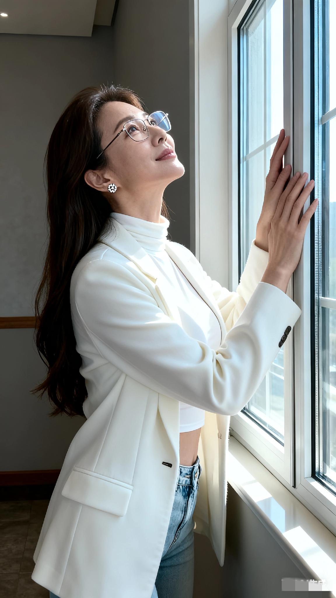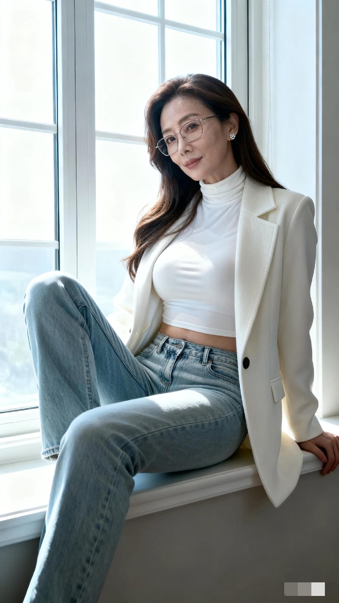 优雅气质,白衣飘飘,自信微笑,时尚眼镜,完美穿搭!