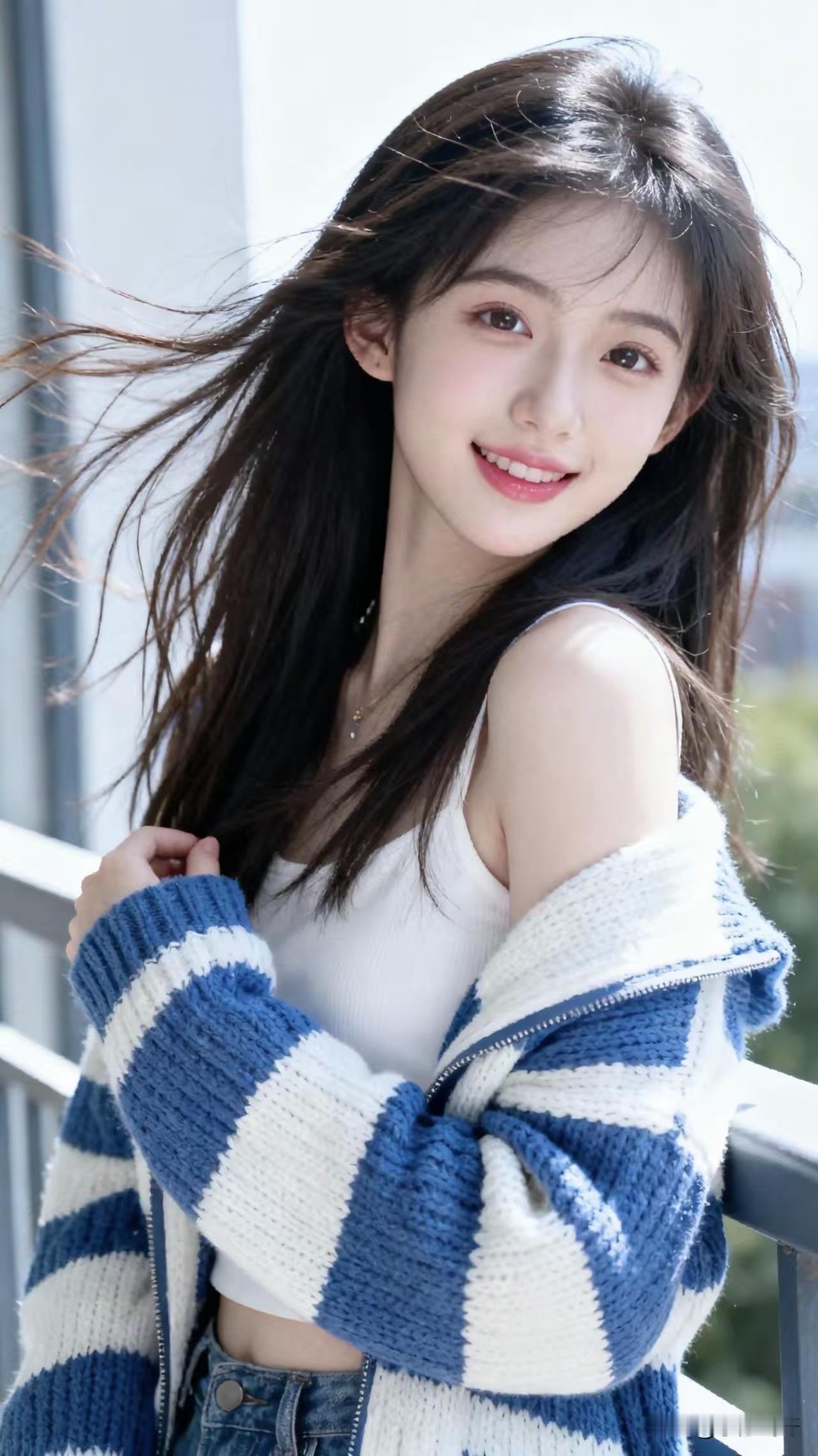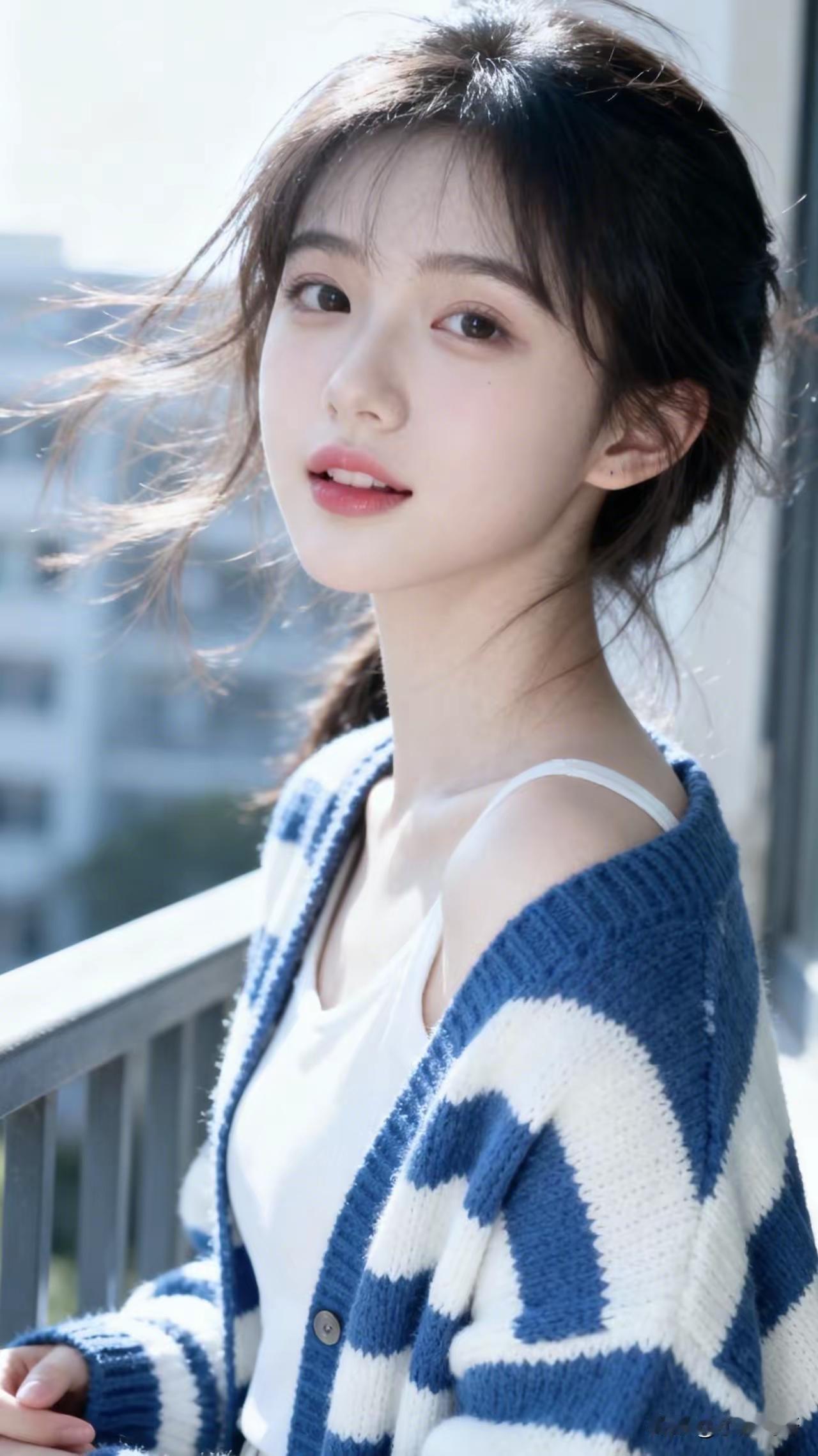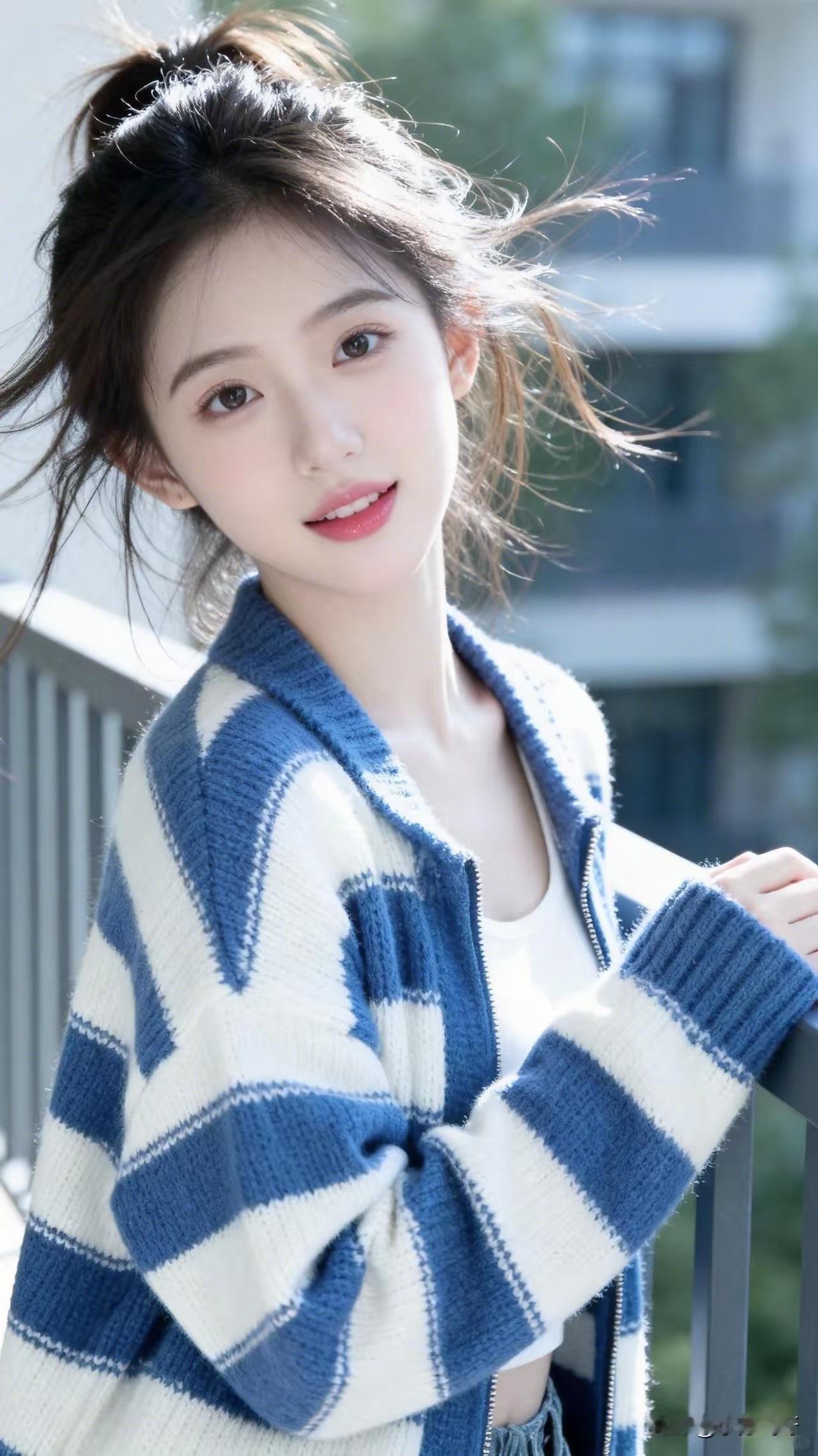 阳光下的微笑,蓝白条纹的温暖,少女心满满的一天🌞💙💙让人心动的女孩子,你喜