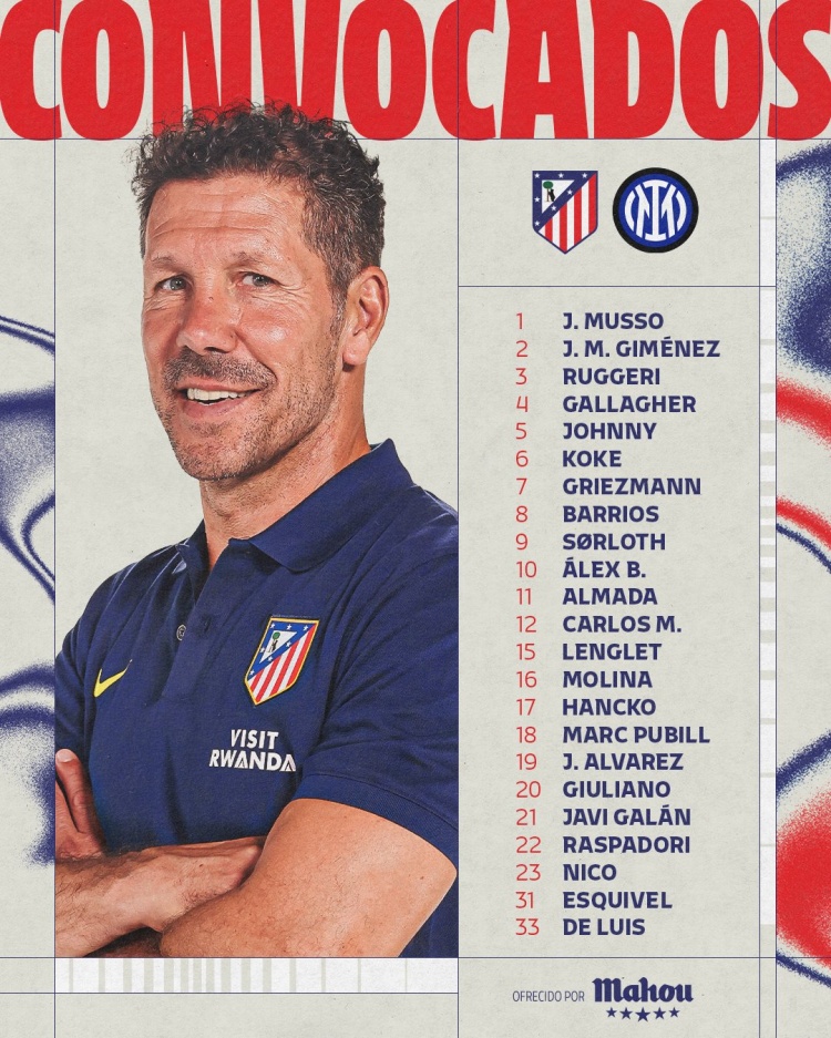 前锋:7-格列兹曼、9-瑟尔洛特、11-阿尔马达、19-阿尔瓦雷斯、20-朱利亚诺-西蒙尼、22-拉斯帕多里、23-冈萨雷斯