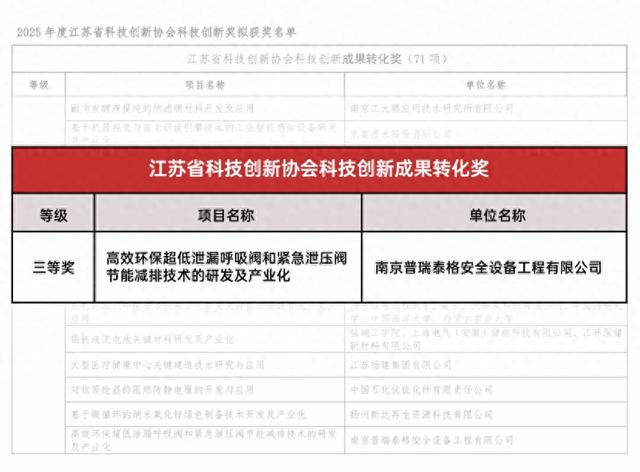 近日,2025年度江苏省科技创新协会科技创新奖获奖名单正式公布,普瑞泰格®凭借“高效环保超低泄漏呼吸阀和紧急泄压阀节能减排技术的研发及产业化”项目,荣获江苏省科技创新协会科技创新成果转化奖三等奖!
