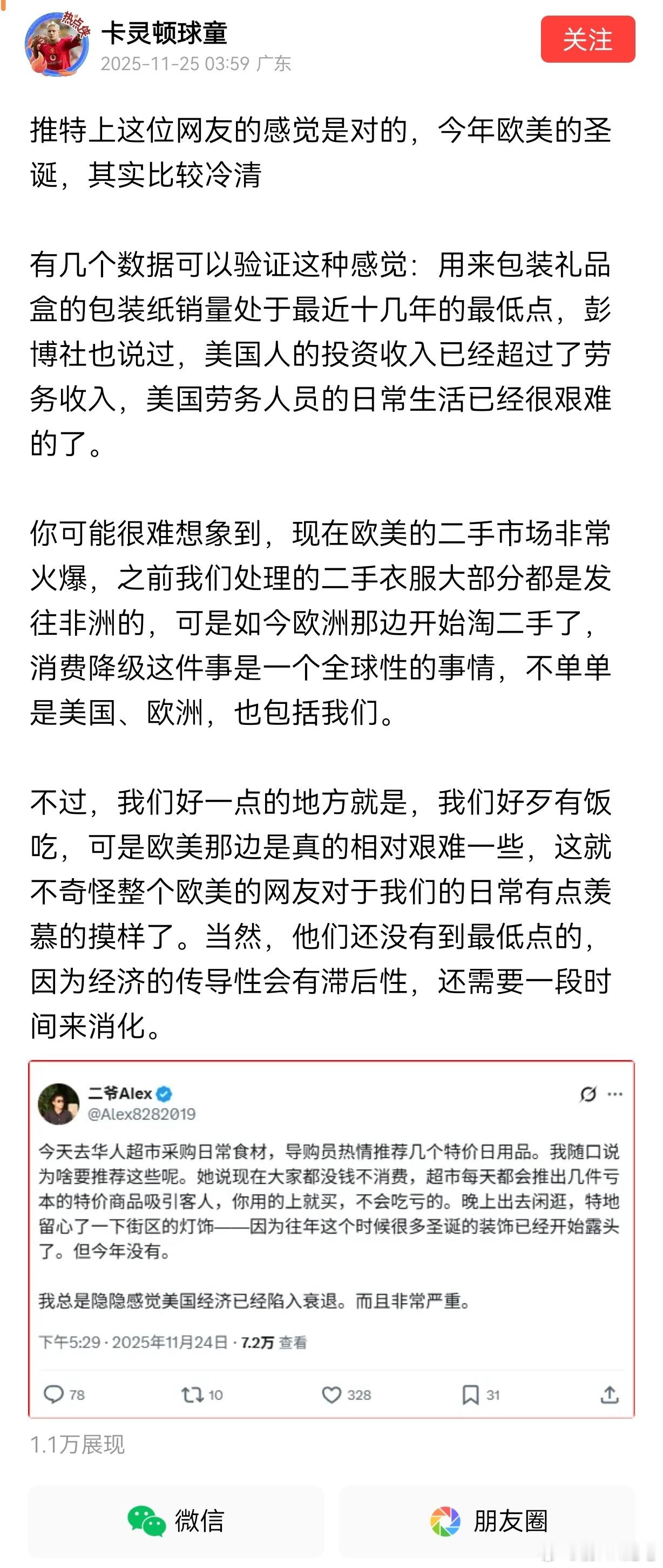 美国网友说:今年欧美的圣诞,其实比较冷清!有几个数据可以验证这种感觉:用来包装礼品盒的包装纸销量处于最近十几年的最低点。彭博社也说过,美国人的投资收入已经超过了劳务收入,美国劳务人员的日常生活已经很艰难的了。更令人意外的是,现在欧美的二手市场非常火爆,之前中国处理的二手衣服大部分都是发往非洲的,可是如今欧洲那边开始淘中国的二手衣服了,这太令人吃惊了。早就说过,中国最底层1/3人口的生活质量是强于欧美的最底层1/3,中国现在买二手衣服的人,寥寥无几。