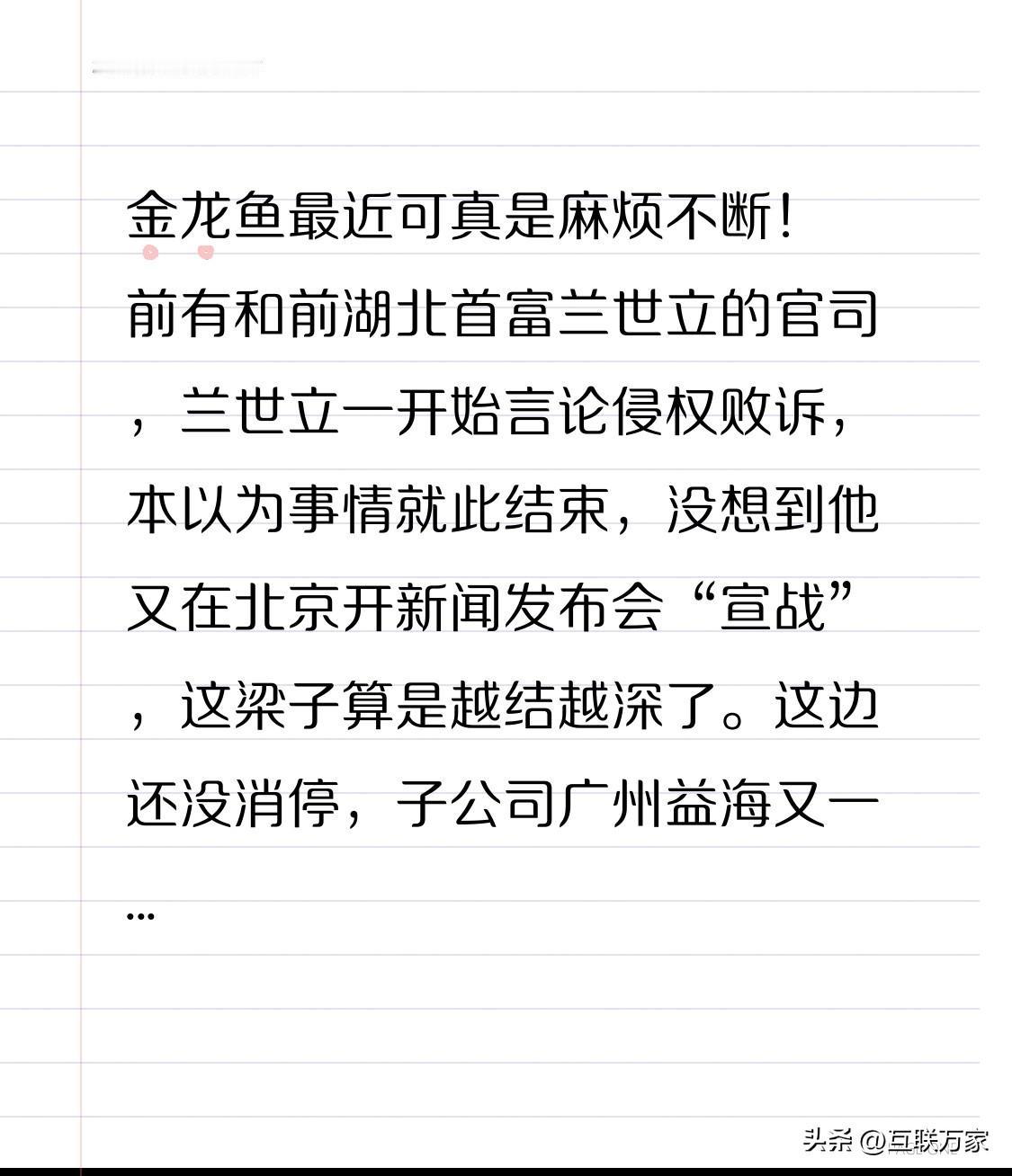 金龙鱼最近可真是麻烦不断!前有和前湖北首富兰世立的官司,兰世立一开始言论侵权败诉,本以为事情就此结束,没想到他又在北京开新闻发布会“宣战”,这梁子算是越结越深了。 这边还没消停,子公司广州益海又一审败诉,要对被害单位安徽华文的18.81亿元经济损失与云南惠嘉承担共同退赔责任。今年前三季度金龙鱼归母净利润才27.49亿元,这要是按判决赔了,利润得受多大冲击啊!不过广州益海不认可判决,选择上诉。 金龙鱼市值如今只剩高峰时的五分之一,后续这两场风波会怎么发展呢?它能顺利化解危机吗?大家怎么看金龙鱼的这些事儿呢? 金龙鱼 黄金龙鱼 黄金条龙鱼 兰世立 湖北兰世立 湖北金龙鱼 外资金龙鱼 金龙鱼植物油 金龙鱼低芥酸油 平凉金龙鱼广告
