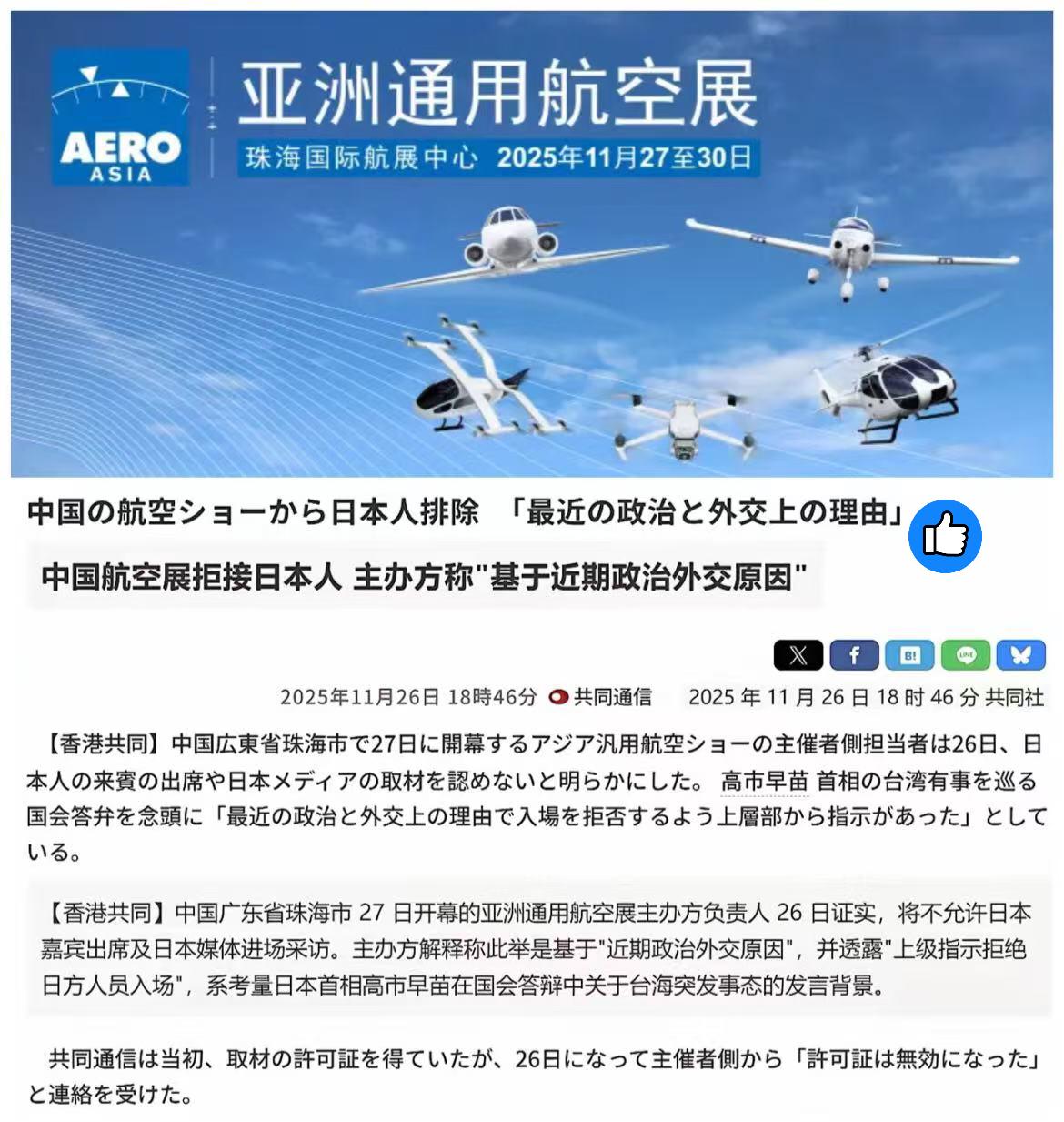 珠海航展拒绝接待日本人!日本共同社报道称,中国广东省珠海市 27 日开幕的亚洲通用航空展主办方负责人 26 日证实,将不允许日本嘉宾出席及日本媒体进场采访。 一句话——不给你来,就是态度;不给你拍,就是信号。 先把时间线拎出来。 本月中旬,高市早苗刚在涉台问题上发表了一通“引火上身”的言论;紧接着,日本政坛有人配合炒作所谓“台海威胁”;再到日美菲联合军演把“堤丰”导弹亮出来,射程直指华东方向。你一而再挑战底线,中国这边必须亮明立场。 这次珠海的“不接待”,不是临时起意,更不是小题大做,而是一次非常清晰的“场内与场外同时发出的信号”。 第一,这是安全底线问题。 珠海航展是展示高端装备、关键技术的地方,任何可能对我国军事工业“带节奏”“做文章”的外媒,本就要严格把关。更何况这段时间,日本媒体在涉华报道上套路明显,断章取义不止一次。既然如此,那就干脆请回去,省得添乱。 第二,中国方面的耐心是有限的。 过去给日本媒体的采访便利,是基于相互尊重。但现在,日本国内不断有人炒作“对华强硬”,甚至把军事议题当成选票筹码。你拿我当靶子,我没必要给你当舞台。很简单的道理。 第三,也是最关键的一点——这是对日本政坛某些人的“敲黑板”。 别觉得把导弹搬到演习场、把话说得难听,就能压中国一头。珠海航展这类国际级舞台,某种意义上就是民间层面的“外交温度计”。不给你参与的资格,就是告诉你:想玩强硬,必须先学会尊重。 更何况,中国现在军工的实力,是摁得住气场的。 无人机到大型运输机,雷达到发动机,很多型号你光站在外面看外形,都够你写三天稿子,更别说里面的技术细节。不给你拍、不给你问,就是不给你拿去做文章的机会。 说到底,这不是“封闭”,而是“防止被利用”; 不是“针对日本人民”,而是针对少数政客的错误言行。 中国的态度一直很清楚——想交流,要真诚;想挑衅,别想踩着我来刷存在感。 未来中日关系怎么走,不是看喊口号谁更响,而是看谁能真正把地区稳定放在心里。 各位读者,你们怎么看这次珠海航展的做法?欢迎在评论区聊聊。