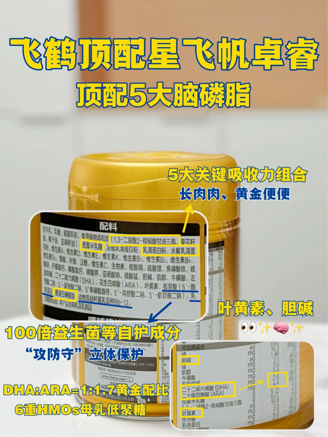 🔹除此之外,营养补充也是必不可少的,我们家喝的是[向右R]飞鹤顶配星飞帆卓睿,里面超多对小脑瓜友好的营养。含有的5大脑磷脂,支持宝宝一生探索,同时搭配黄金配比1:1.7的DHA和ARA,很适合正在脑发育黄金期的宝宝喝!