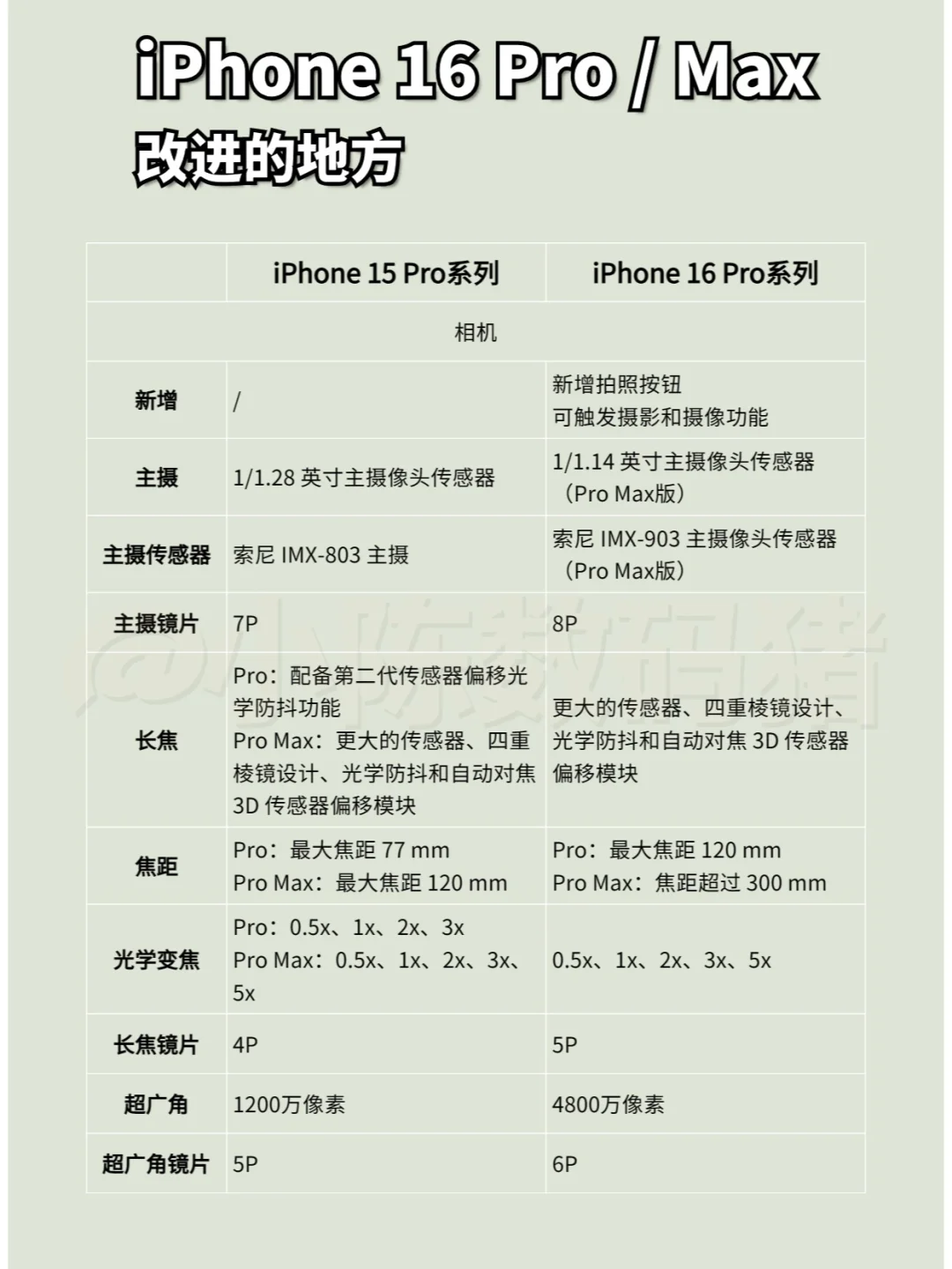 16Pro Max无论是主摄传感器还是镜头片数都有所升级。