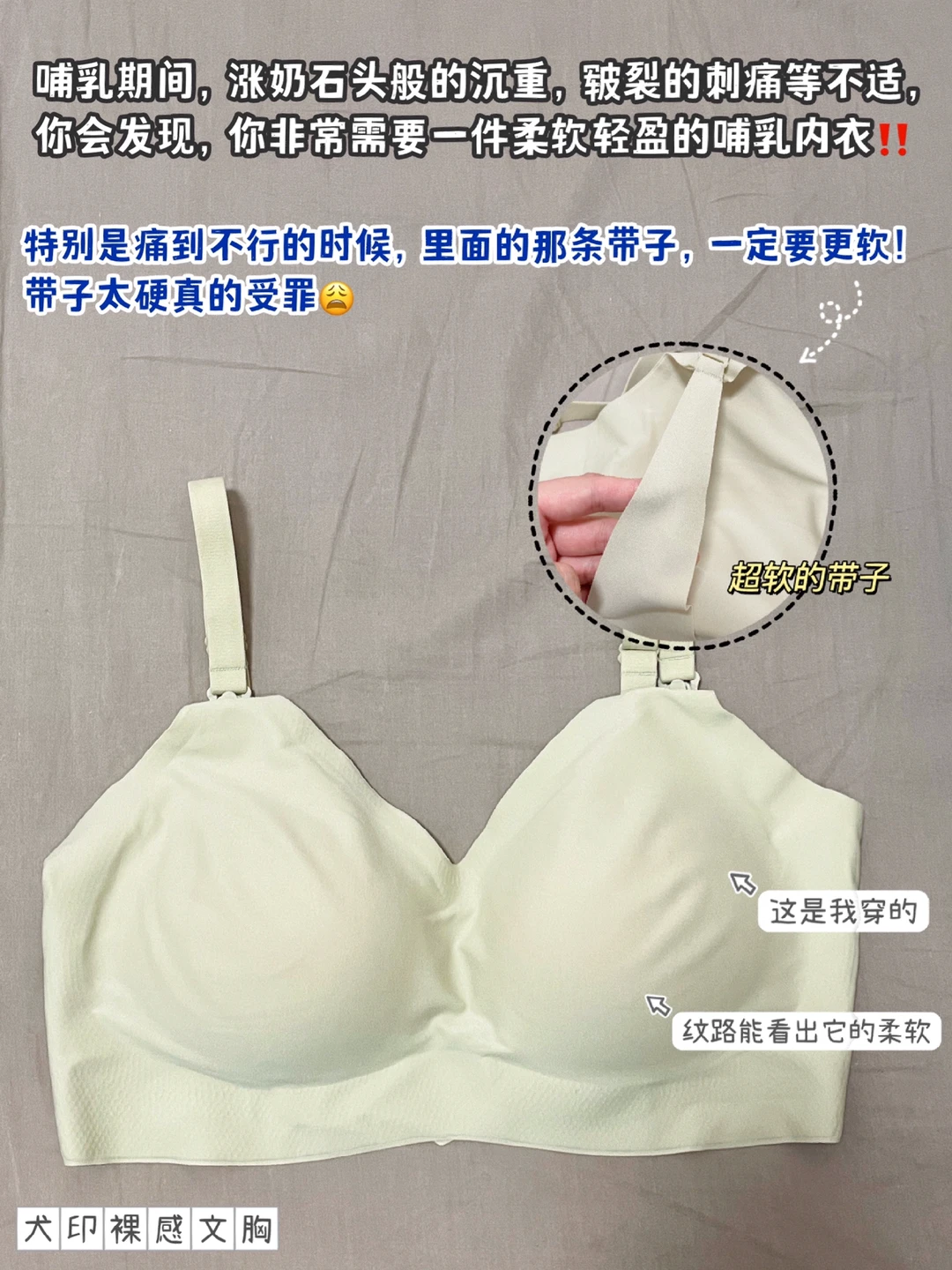 内衣要求有三:①轻盈柔软(减轻哺乳期RF的不适);②可单手脱下扣上(高效奶娃)。③健康除臭面料(拒绝哺乳期异味尴尬)。这里推荐犬印本铺裸感内衣,目前我穿过觉得又轻又柔软的一款,rt皲裂的时候穿它度过,不会被磨疼,也不容易滋生细菌!