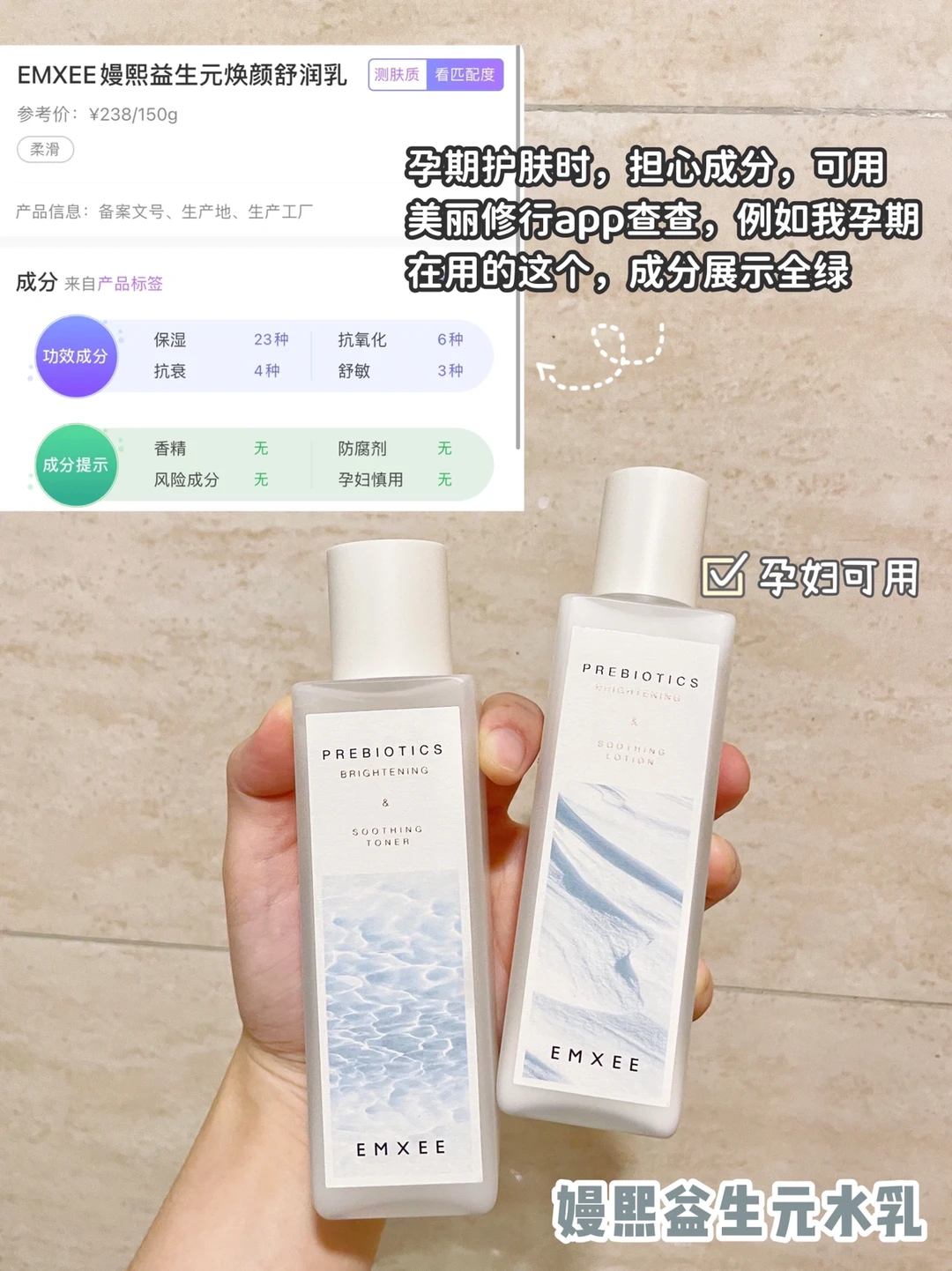 ▪️我用的是嫚熙益生元水乳,查了美修是可用的孕妇护肤品。它里面的益生元,可以激活皮肤上益生菌的生长,维持肌肤微生态的平衡,稳定肌肤屏障;另一个核心成分则是积雪草和神经酰胺,可修复肌肤,维持稳定的,补水也很快,上脸也不油不闷。孕期皮肤比较敏感,有的爆痘有的起皮干燥,需要早晚坚持护肤保湿维稳!