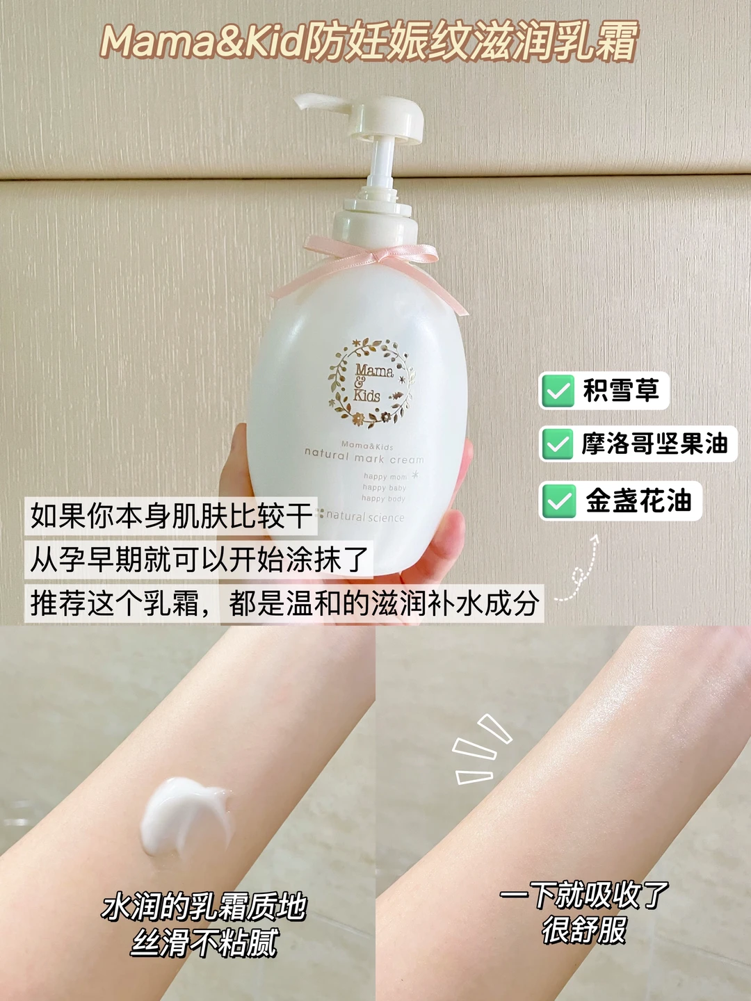 🔹推荐含油型的乳霜,如Mama&Kids防妊娠纹乳霜,就有油的滋润,也有乳霜的清爽,对皮肤很友好,不会觉得油腻腻不吸收!而且温和没什么味道,不会刺激到孕吐。它里面含的积雪草萃取精华,是可以增加肌肤弹性的原料,坚持每天涂抹,肚子突撑大了也不担心。