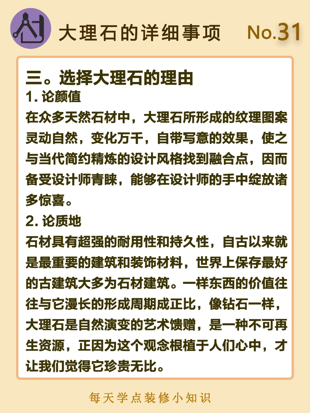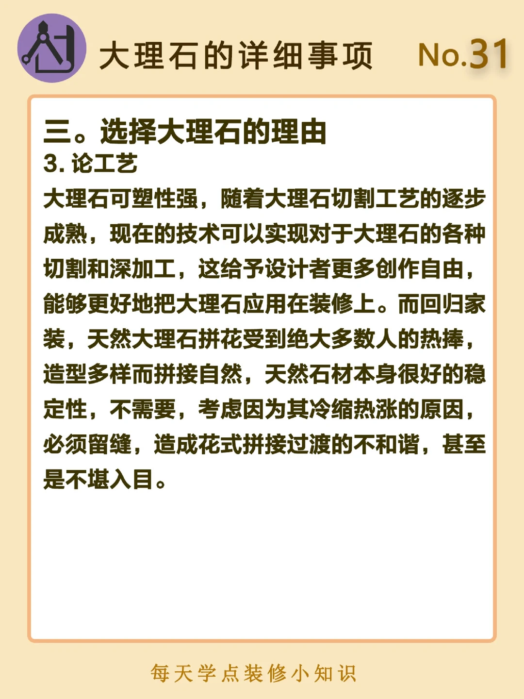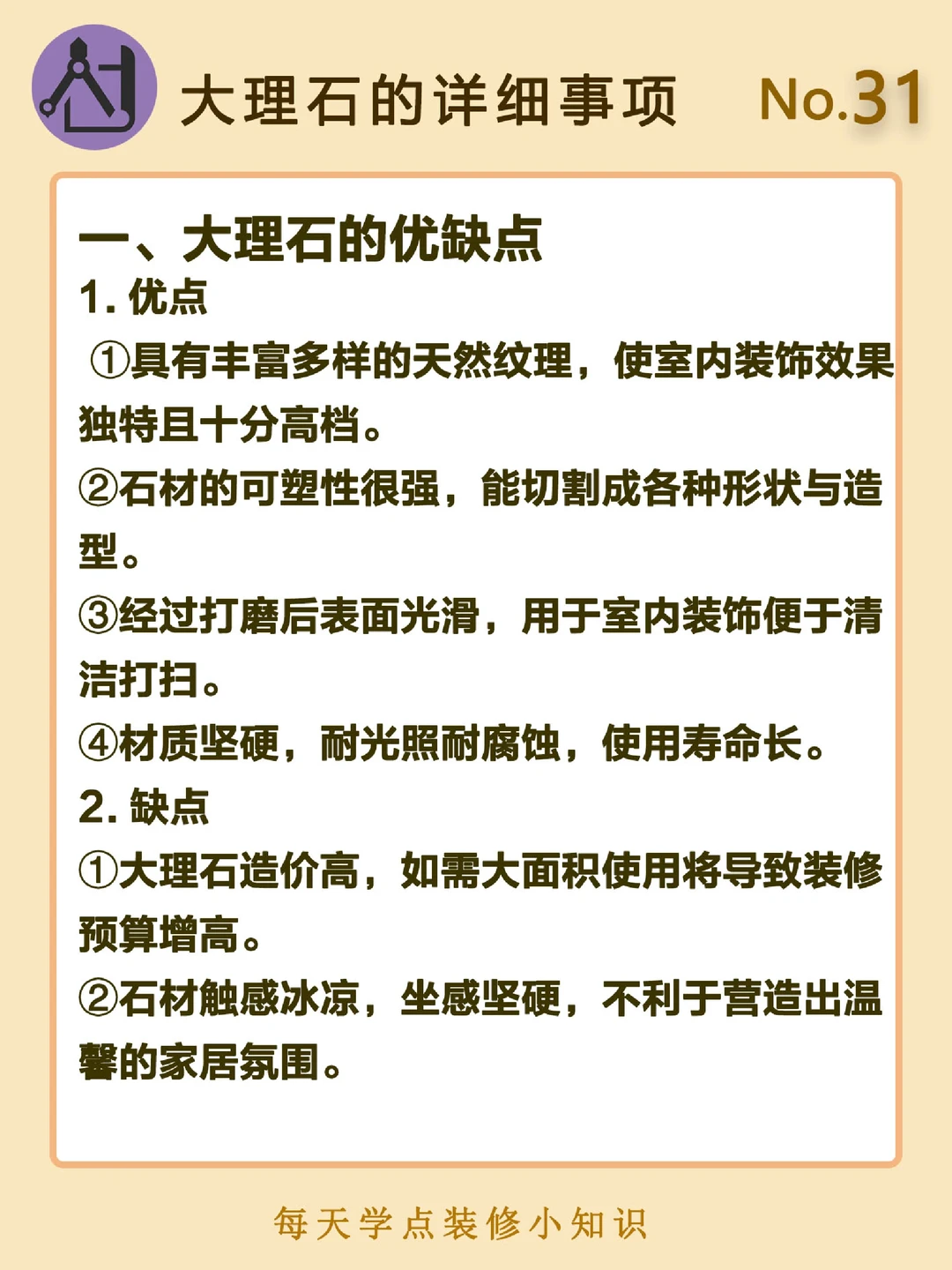 ①大理石造价高,如需大面积使用将导致装修预算增高。