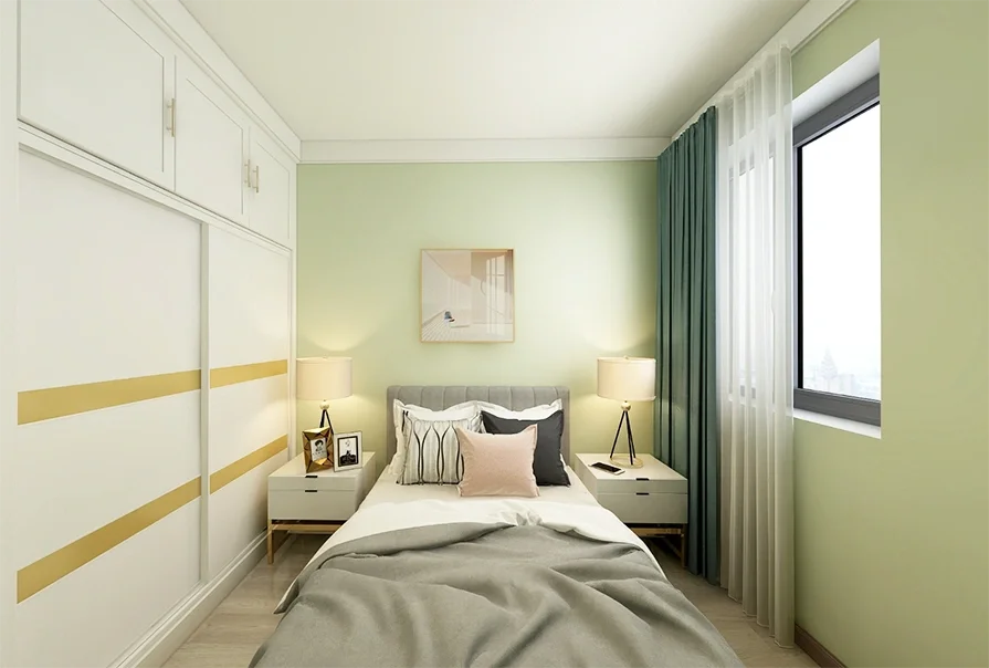 次卧的墙面和床品选择了绿色的元素,给人一种清新的感觉,心情十分的舒畅,不压抑。