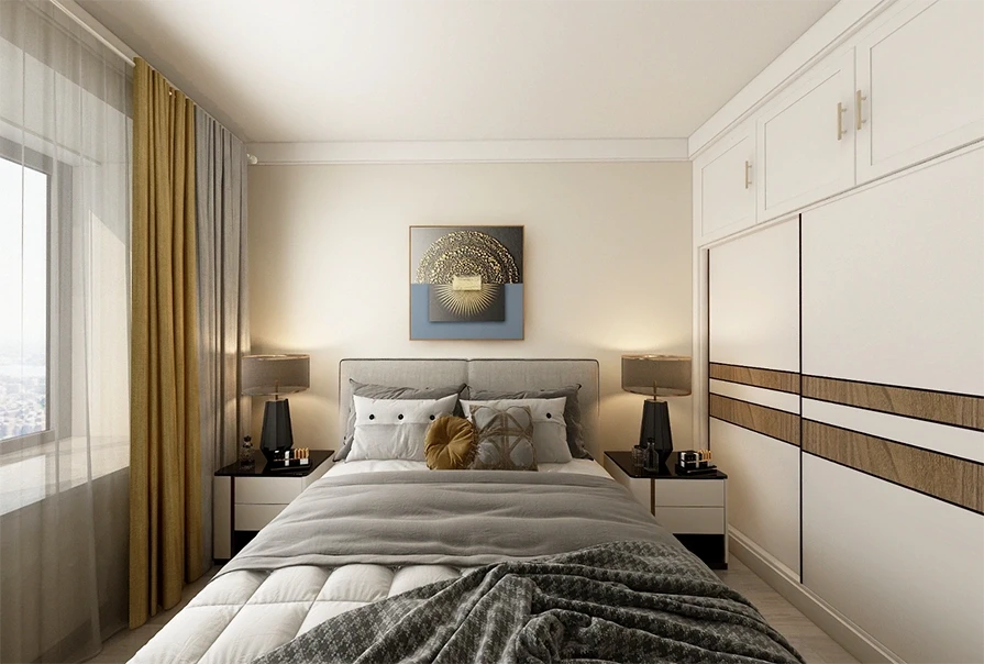 🌈卧室依旧使用米白色作为空间的主色调,暖灰色的床品打造了一个舒适的休憩空间,浅灰色的床背搭配墙上的简约线条,加上定制推拉门衣柜,营造了空间整体的简约氛围。