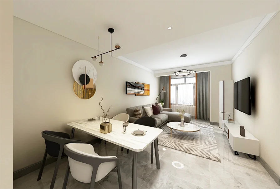 🌈客餐一体节省了不少空间,岩板餐桌美观高级,跳色餐椅增添了一分活跃的感觉。客厅与餐厅两个空间用通过灰色地砖连接在一起,同时用毛绒绒的地毯巧妙了做了无形中的空间隔断,自然好看。