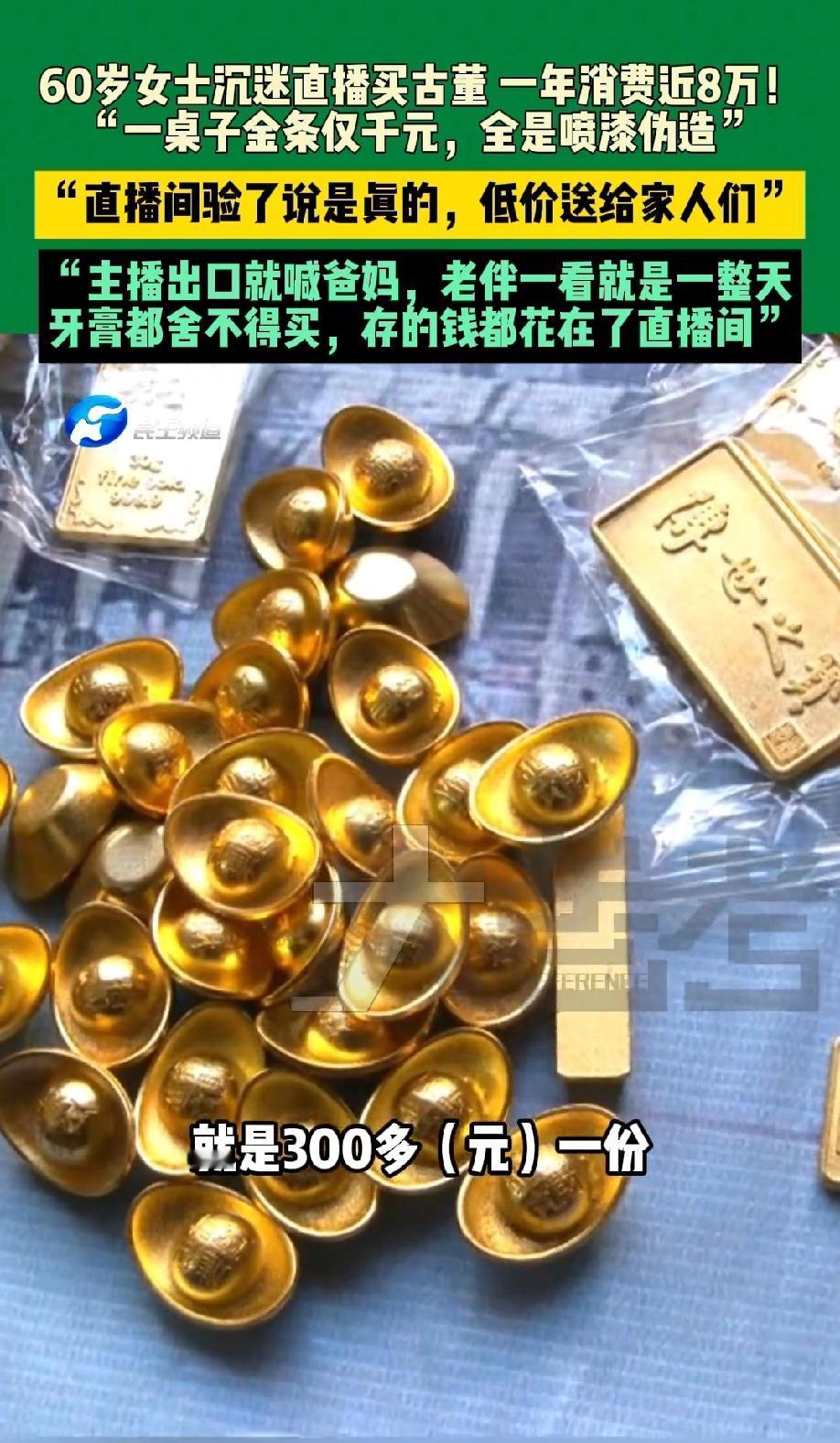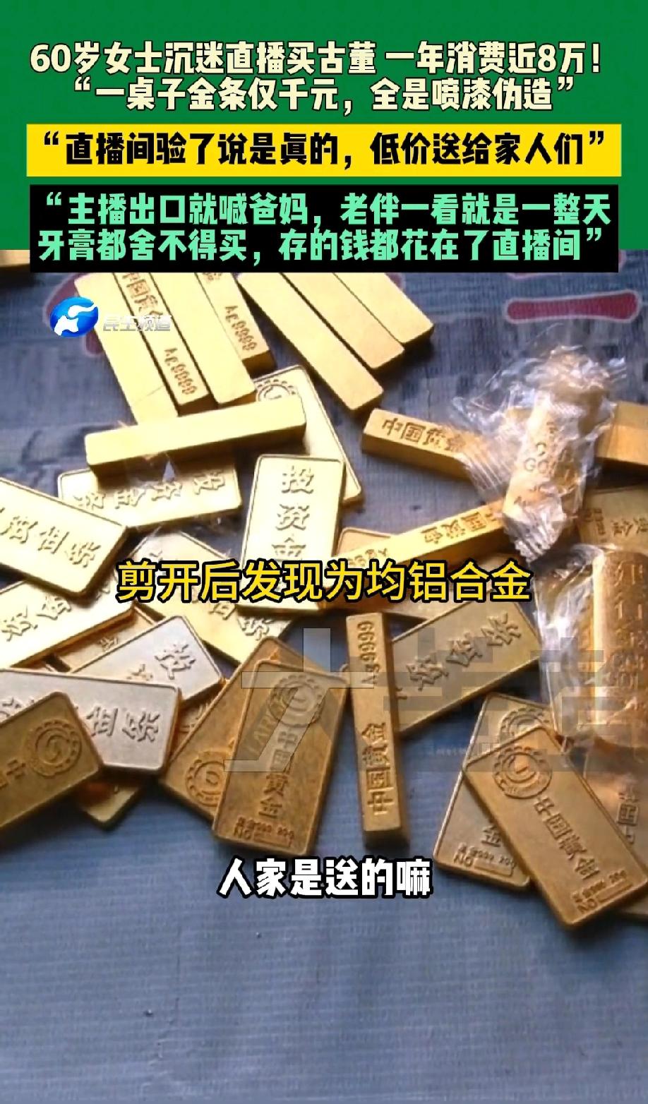 河南南阳,一位60岁的阿姨,平常时间省吃俭用,连几块钱的牙膏都舍不得买,衣服更是穿旧了缝缝补补继续穿,好不容易攒下8万养老钱,却迷上了卖“金条”的直播间,在主播一口一个“爸妈”“家人”的叫喊声中,阿姨疯狂下单了无数“金条”,结果一坚定才发现,一桌子“金条”加起来才值千元,养老钱全打了水漂! (来源:大参考) 这事得从去年说起,阿姨偶然刷到一个古董直播间,里面的主播嘴甜得发齁,一口一个“爸妈”“家人”地喊着,还总上演“为家人抢福利”的戏码。 主播拿着金光闪闪的“金条”说,这是自己好不容易从“内部渠道”拿到的真品,商场卖好几万,今天只收千元成本价,就是想送给支持自己的家人们。 看着主播把“金条”说得天花乱坠,还现场展示“鉴定”过程,阿姨彻底动了心。 从那以后,阿姨就像着了魔一样,每天雷打不动守在直播间,一看就是一整天。主播喊“上链接”,她就立马下单,生怕慢一步就抢不到“宝贝”。 一年下来,家里堆了满满一桌子“金条”“古币”“玉器”,全是从直播间抢来的“低价真品”。 直到家人觉得不对劲,带着这些“宝贝”去鉴定,才发现全是假货——那些金灿灿的金条,不过是廉价金属外面喷了层漆,成本连一百块都不到,一桌子“藏品”加起来也就值千元。 家人又气又心疼,劝阿姨别再上当了,可她根本听不进去,还坚信主播不会骗自己,说那些鉴定的人是“不识货”。 其实阿姨不是不差钱,她平时买菜都要货比三家,衣服穿旧了也舍不得扔,只是主播的甜言蜜语和虚假福利,让她感受到了久违的关注和信任。 说到底,这类直播间骗的就是老年人的孤独和信任。主播们用“爸妈”的称呼拉近距离,用“低价真品”的噱头制造诱惑,把拙劣的假货包装成宝贝。 希望相关部门能加大监管力度,好好管管这些虚假直播,也提醒家里有老人的朋友,多花点时间陪陪长辈,给他们讲讲直播套路。老年人攒点钱不容易,可别让这些黑心主播,把他们的养老钱骗得一干二净。