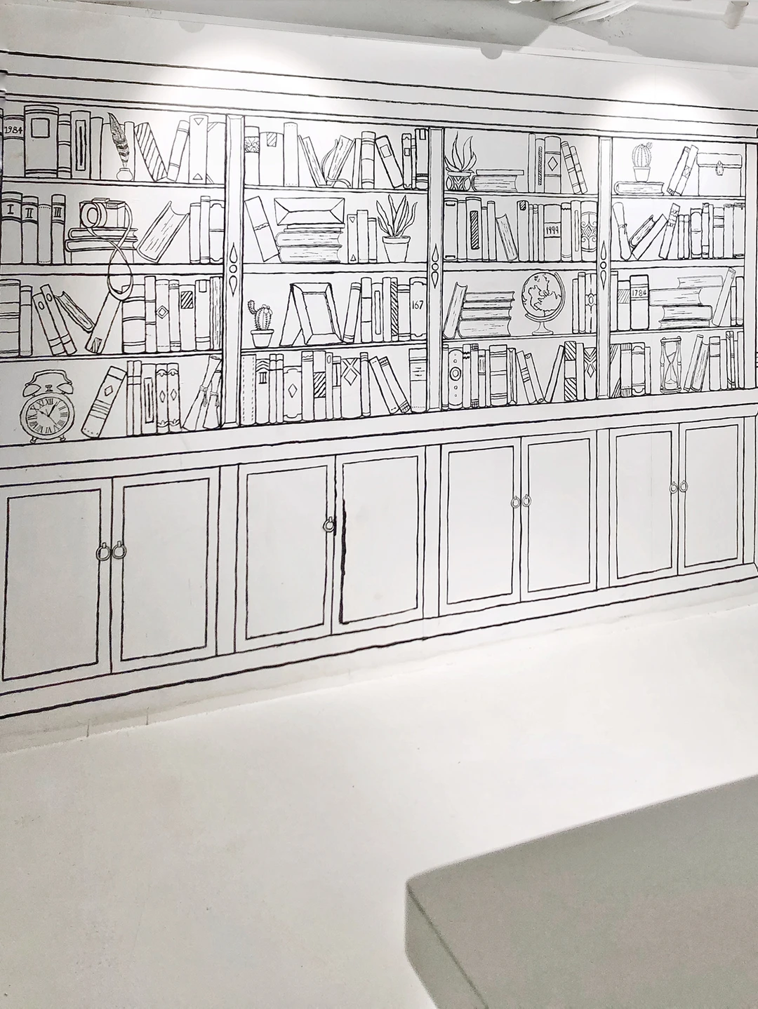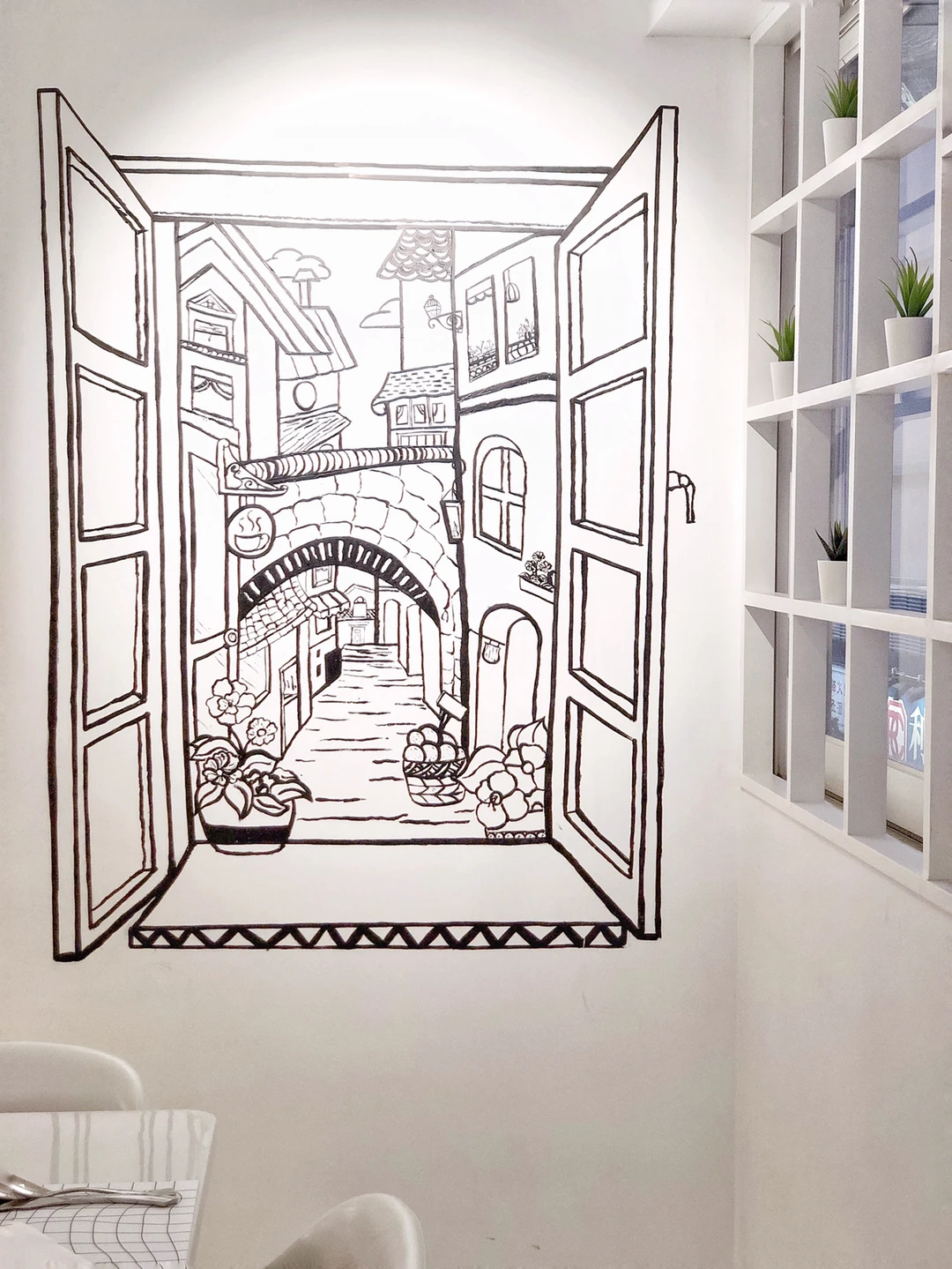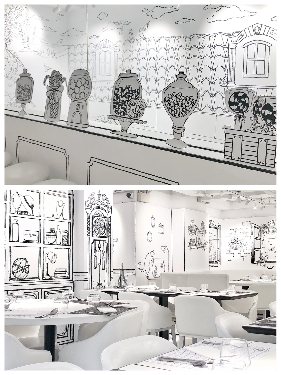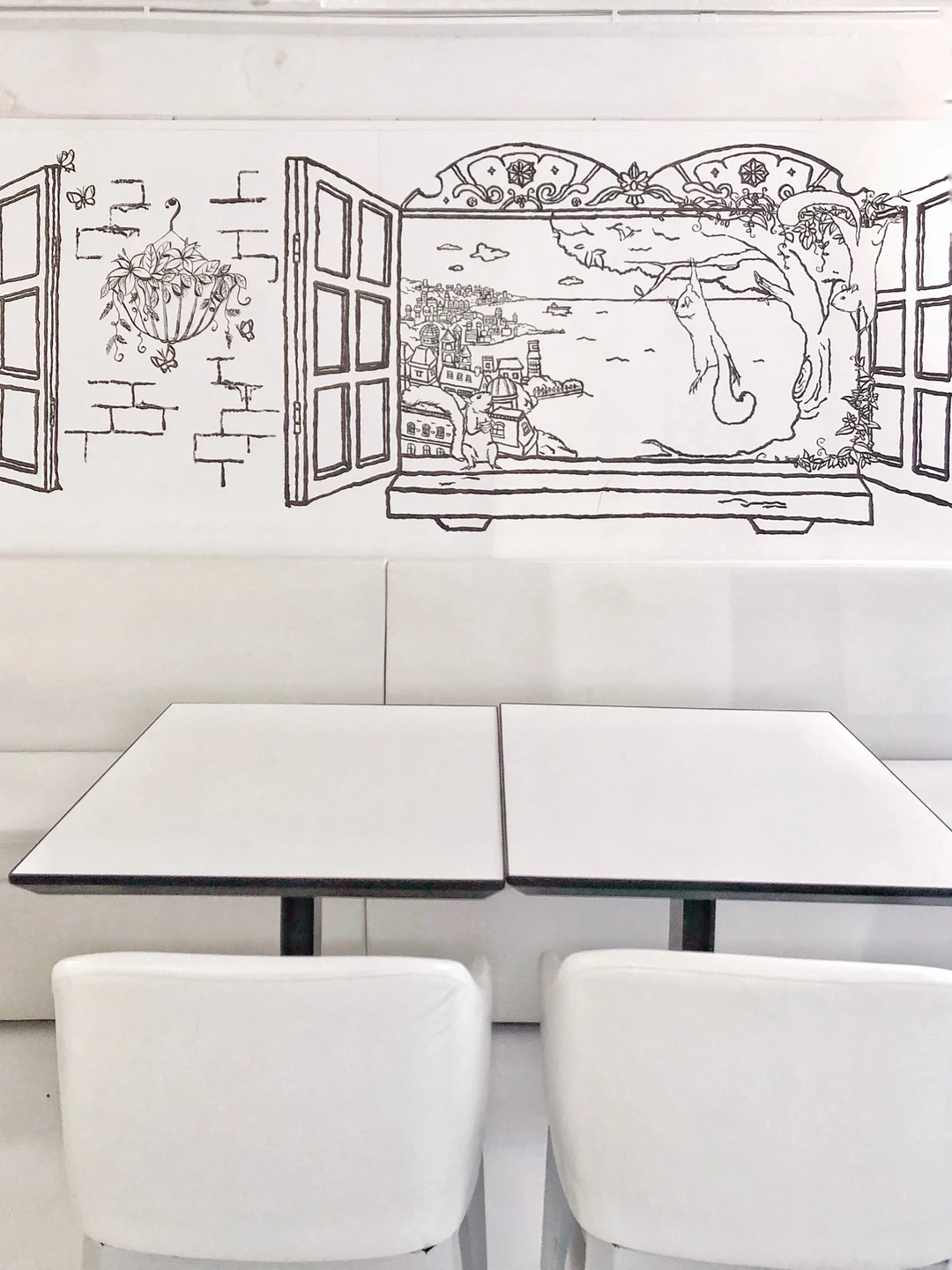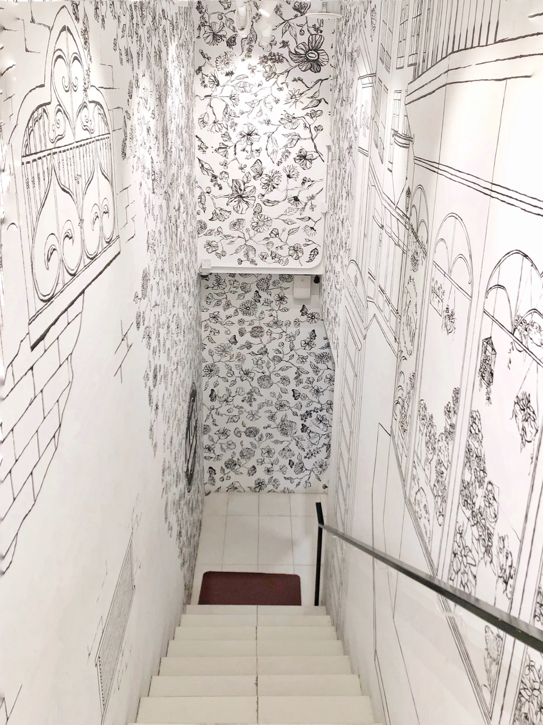 ◼️◻️咖啡店的门口很吸引我,让我想起伦敦的一家曲奇店🍪Biscuit boutique,黑白手绘,非常梦幻。一进门,沿楼梯往上看,就像步入一个黑白画册。咖啡店也比想象中大很多,走廊迂回曲折,但也可以欣赏壁画,真的很惊喜,很想dreamy secret garden🌸🌼🌻壁画里有客厅、梳妆台、花园、梦幻小镇…还能发现一些铅笔手绘的痕迹,真的很喜欢。