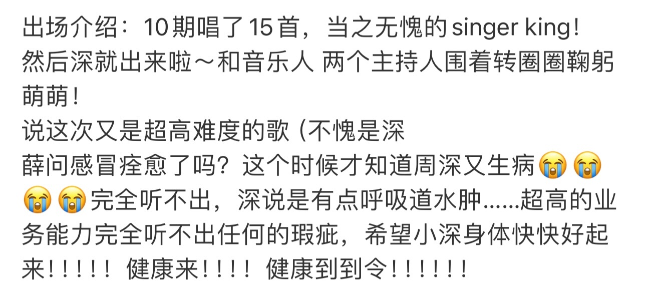 因为昨天的一些节目录制repo,粉丝得知周深感冒生病了很担心。没想到周深半夜上线