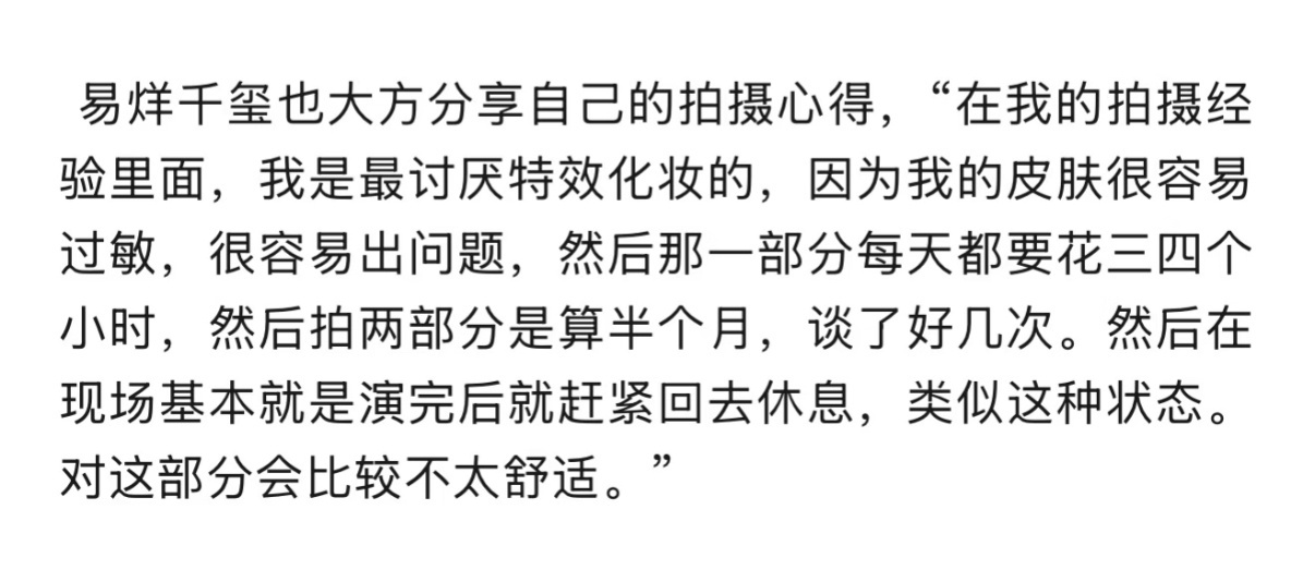 千玺依然是遇到最敬业最配合的演员,没有之一所以这就是那时候易烊千玺说皮肤很敏感很