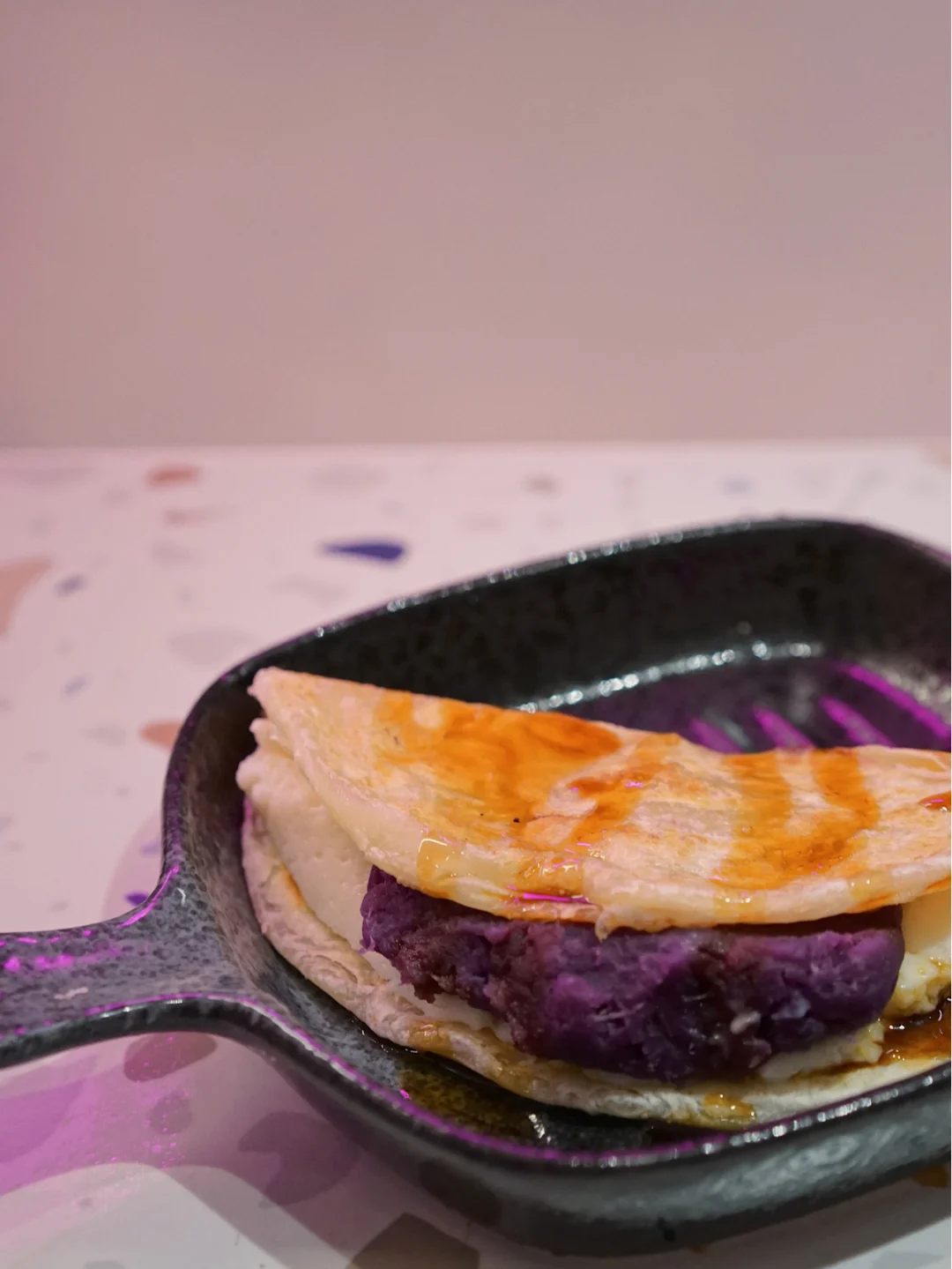 4⃣️紫薯蛋饼配鲜奶黑糖浆:我很喜欢里面的甜薯,至于蛋饼,实在太饱,没能吃下。