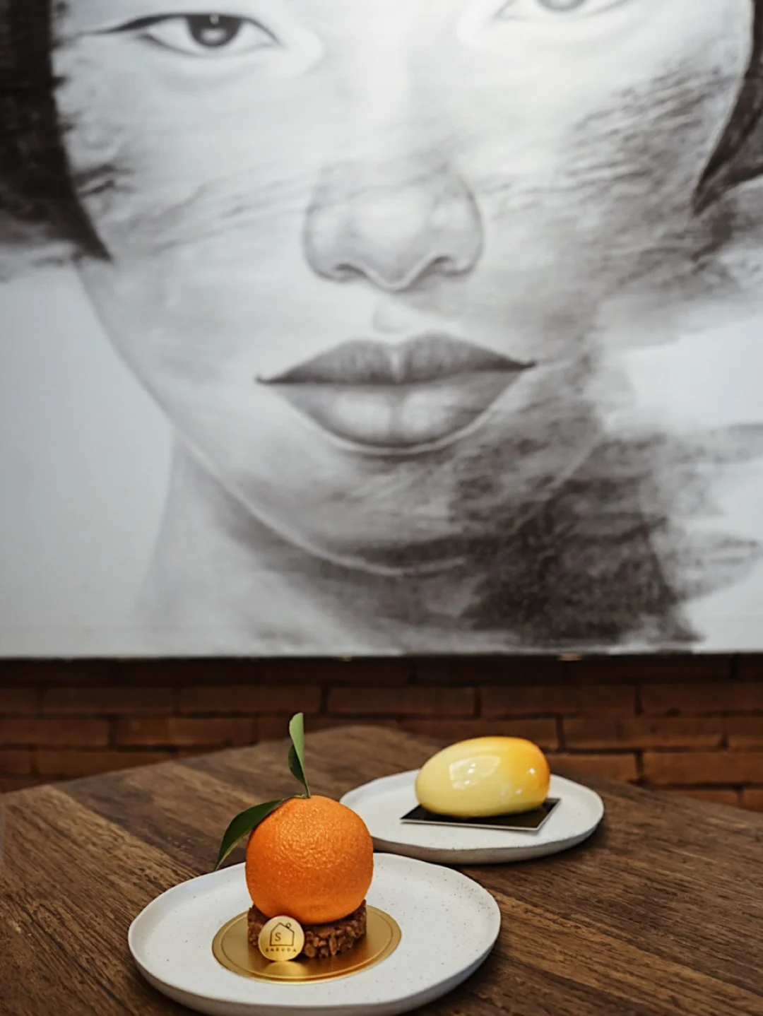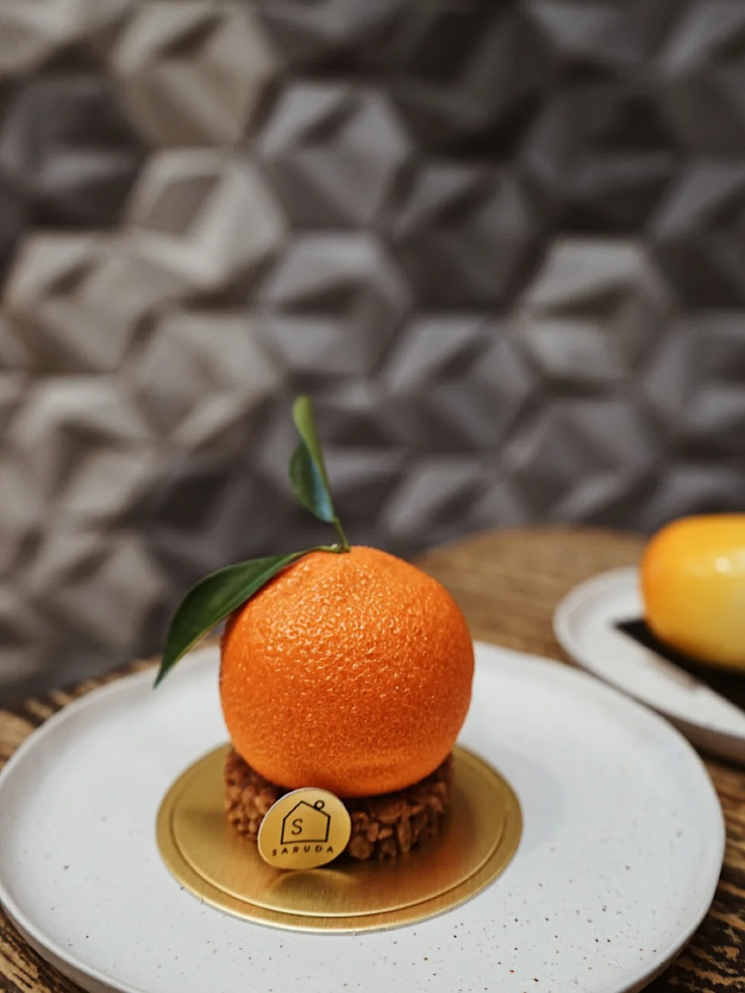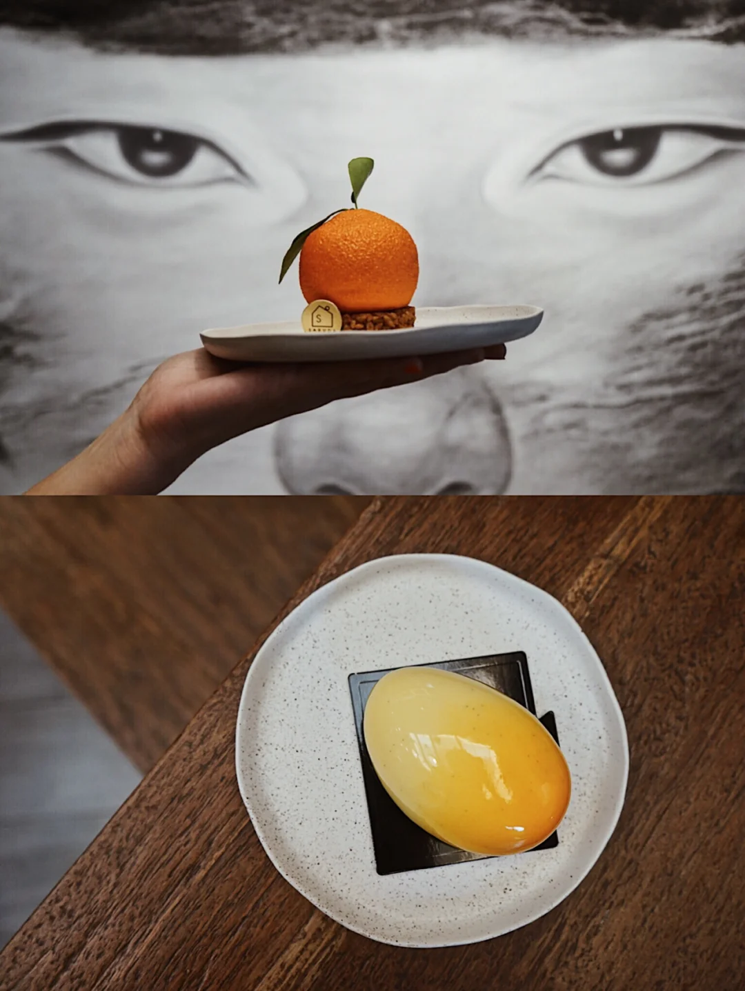 🍊🥭喜欢这家甜品店,完全是被逼真的造型所吸引。比如Orange Bliss,连橙子🍊的纹路都清晰可见。其实是巧克力🍫的脆皮。敲开外皮后,则是清爽多汁的橙子果肉,看着非常诱人。据说这一道甜品都要花上至少10道工序,据说需要两天的时间,从熬制果酱,还有慕斯罐模,淋面还有喷涂釉,每一个步骤都倾注甜品师的匠心。
