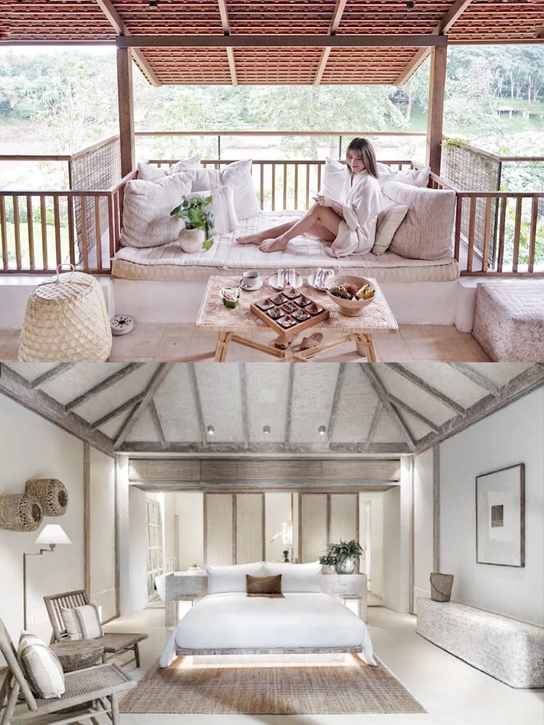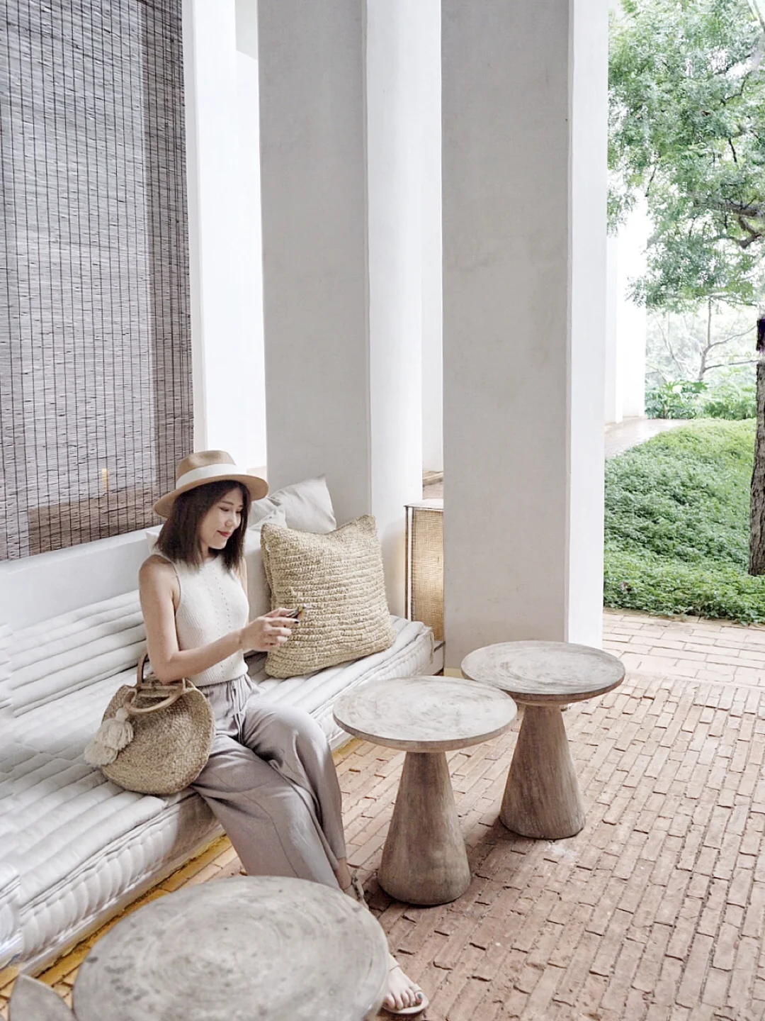 ⚪️⚫️我和朋友住的是Huen Bon套房,在三楼,前台的服务员给我做room tour的时候,我真的觉得很多巧思和惊喜。1⃣️整体色调,带着禅意,让人放松。2⃣️Mini Bar,茶叶盒里有各种烘干的花和茶叶。我后来泡了rose Petal, butterfly pee的花茶,味道清新,很适合夏天。3⃣️大浴缸🛁:手雕柚木浴室镜,当地匠人制作的陶瓷砖,很敞亮。⚠️⚠️只有三楼的套房的露台垫子才是奶油白色的,我个人觉得白色比黑色的要好看很多。
