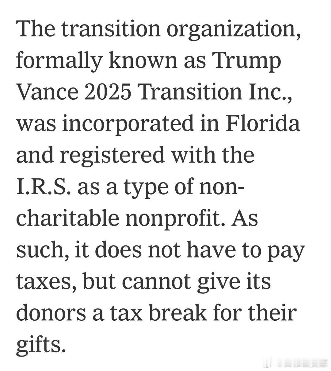 去年11月当选到今年1月就职,T的“过渡期”在佛州注册了一个“非营利组织”、不用交税,共收到46人的$1400万“捐款”,其中包括后来被任命为“总统特使”的Witkoff、商务部长Lutnick、教育部长McMahon、司法部副部长Woodward、俄亥俄南区联邦检察官Gerace…等等