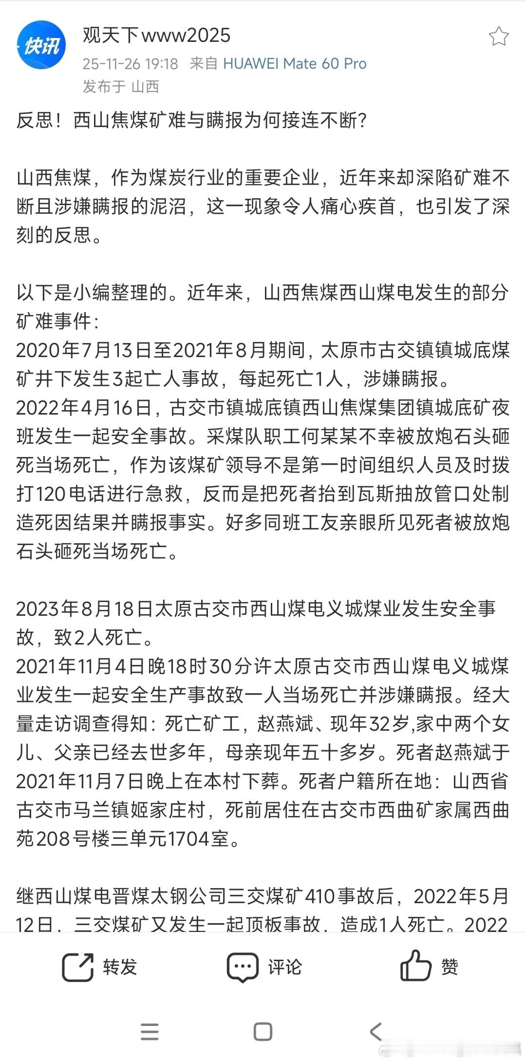 反思!西山焦煤矿难与瞒报为何接连不断?山西焦煤,作为煤炭行业的重要企业,近年来却深陷矿难不断且涉嫌瞒报的泥沼,这一现象令人痛心疾首,也引发了深刻的反思。以下是小编整理的。近年来,山西焦煤西山煤电发生的部分矿难事件:2020年7月13日至2021年8月期间,太原市古交镇镇城底煤矿井下发生3起亡人事故,每起死亡1人,涉嫌瞒报。 2022年4月16日,古交市镇城底镇西山焦煤集团镇城底矿夜班发生一起安全事故。采煤队职工何某某不幸被放炮石头砸死当场死亡,作为该煤矿领导不是第一时间组织人员及时拨打120电话进行急救,反而是把死者抬到瓦斯抽放管口处制造死因结果并瞒报事实。好多同班工友亲眼所见死者被放炮石头砸死当场死亡。2023年8月18日太原古交市西山煤电义城煤业发生安全事故,致2人死亡。2021年11月4日晚18时30分许太原古交市西山煤电义城煤业发生一起安全生产事故致一人当场死亡并涉嫌瞒报。经大量走访调查得知:死亡矿工,赵燕斌、现年32岁,家中两个女儿、父亲已经去世多年,母亲现年五十多岁。死者赵燕斌于2021年11月7日晚上在本村下葬。死者户籍所在地:山西省古交市马兰镇姬家庄村,死前居住在古交市西曲矿家属西曲苑208号楼三单元1704室。继西山煤电晋煤太钢公司三交煤矿410事故后,2022年5月12日,三交煤矿又发生一起顶板事故,造成1人死亡。2022年12月23日下午遇难矿工尸体被挖出,矿方安排一面包车拉走。死难矿工姓吕,男,古县古阳镇下辛佛人,家中弟兄四个,排行老四,育有一儿一女。2023年8月18日22时35 分左右西山煤电义城煤业18105备用综采工作面轨道顺槽李某、张某两名作业人员在使用手拉葫芦斜拉乳化液箱时,锚链末端专用勾头的卡环脱落,导致乳化液箱向采帮侧翻,将李某、张某两人挤伤,经抢救无效死亡。2022年7月10日早班,西山煤电义城煤业有限公司发生一起安全事故。该事故导致一人死亡。死者:龚某民、43岁、系古交市小南峪村人。事故发生后,义城煤业没有第一时间向上级主管部门上报,而是采取隐报、瞒报的形式和死者家属私达成协议、以460万私了。2018年5月19日,西山煤电斜沟煤矿选煤厂发生一起安全事故,造成一名矿工贾利珍不幸遇难。山西西山煤电集团斜沟矿,位于吕梁市兴县,从刘少杰当上矿长之后,短短的二年来该矿发生多起井下死亡事故。1、2022年6月10号,大学生阎宇井下死亡一例,两个多月隐瞒不报未处理。②2022年7月该矿外包队在井下两名职工打架死亡2人,以私了收官。③2021年6月28日,山西西山晋兴能源有限责任公司斜沟煤矿生产技术科运输组杜刚,在二号副井被车压当场身亡,矿方瞒报,以700万私了。④2021年6月14日,山西西山晋兴能源有限责任公司斜沟煤矿发生一起安全事故,导致1人死亡。死者张赵勇,现年26岁,孝义市下堡镇官窑村人,巨额赔偿私了。⑤2020年该矿以500万私了一名在井下工亡的采矿职工。⑥2020年8月16日,矿工贺园园上夜班,凌晨5时许,从开票处上车途中,被矿上装载机碾压致死。该矿二年来频发六次事故,共死亡7人,都隐瞒不报。2024年7月28日,山西太原清徐(山西焦煤)西山煤电南岭煤业井下二水平北翼轨道大巷发生一起放置铁轨碰伤人事故,造成1人遇难。经初步了解,该矿开拓队两名工人在二水平北翼轨道大巷距下部车场口200米处放置铁轨过程中,将其中一名工人头部碰伤致死。2023年5月29日,古交市西山煤电环保绿化分公司屯兰净水厂工地污水井内发生一起中毒窒息较大事故,造成4人死亡。2020年5月20日,西山煤电集团公司东曲矿发生一起安全事故,造成通风二队瓦检员李东亮当场死亡。事故发生后,矿方未按规定上报政府主管部门,而是通知家属赔偿400万私了。据了解,李东亮,50岁,家住太原市万柏林区白家庄矿二中小区。从以上事件中可以看出,山西焦煤矿难的频繁发生,无疑暴露出企业在安全生产管理方面存在着严重的漏洞。这不仅仅是对矿工生命安全的漠视,更是对整个社会的不负责任。而涉嫌瞒报,则是在矿难的伤口上又撒了一把盐。瞒报行为,是对法律尊严的公然挑战,是对公众知情权的无情剥夺。企业试图通过隐瞒事故来逃避责任和处罚,却不知这种行为只会让问题更加严重。瞒报不仅不能解决问题,反而会掩盖真相,阻碍事故的调查和处理,使安全隐患无法得到及时整改,为更多的悲剧埋下伏笔。同时,监管部门也应深刻反思自身在监管过程中存在的问题,对于瞒报行为,要坚决予以打击,严肃追究相关责任人的法律责任,以儆效尤。只有监管部门切实履行职责,才能有效遏制矿难的发生,保障矿工的生命安全。 山西焦煤的矿难及瞒报事件,时刻提醒着我们,安全生产是一个全社会共同关注的问题,需要企业、政府、社会各方共同努力。企业要切实承担起安全生产的主体责任,政府要加强监管,社会公众要积极参与监督,形成合力,共同为创造一个安全、和谐的生产环境而努力。希望山西焦煤能够以这些血的教训为鉴,深刻反思,加强安全管理,以诚实和担当的态度,面对事故,积极配合调查和处理,不再隐瞒真相。