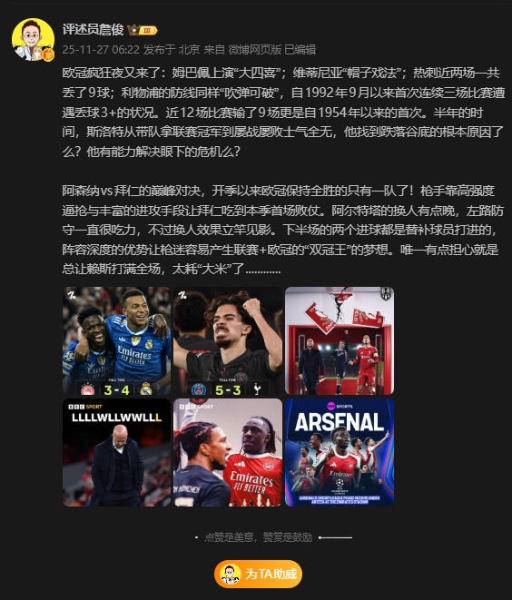 直播吧11月27日讯欧冠第5轮比赛战罢,阿森纳5战全胜排名榜首,利物浦惨败埃因霍温,评述员詹俊先生在社媒做出点评。