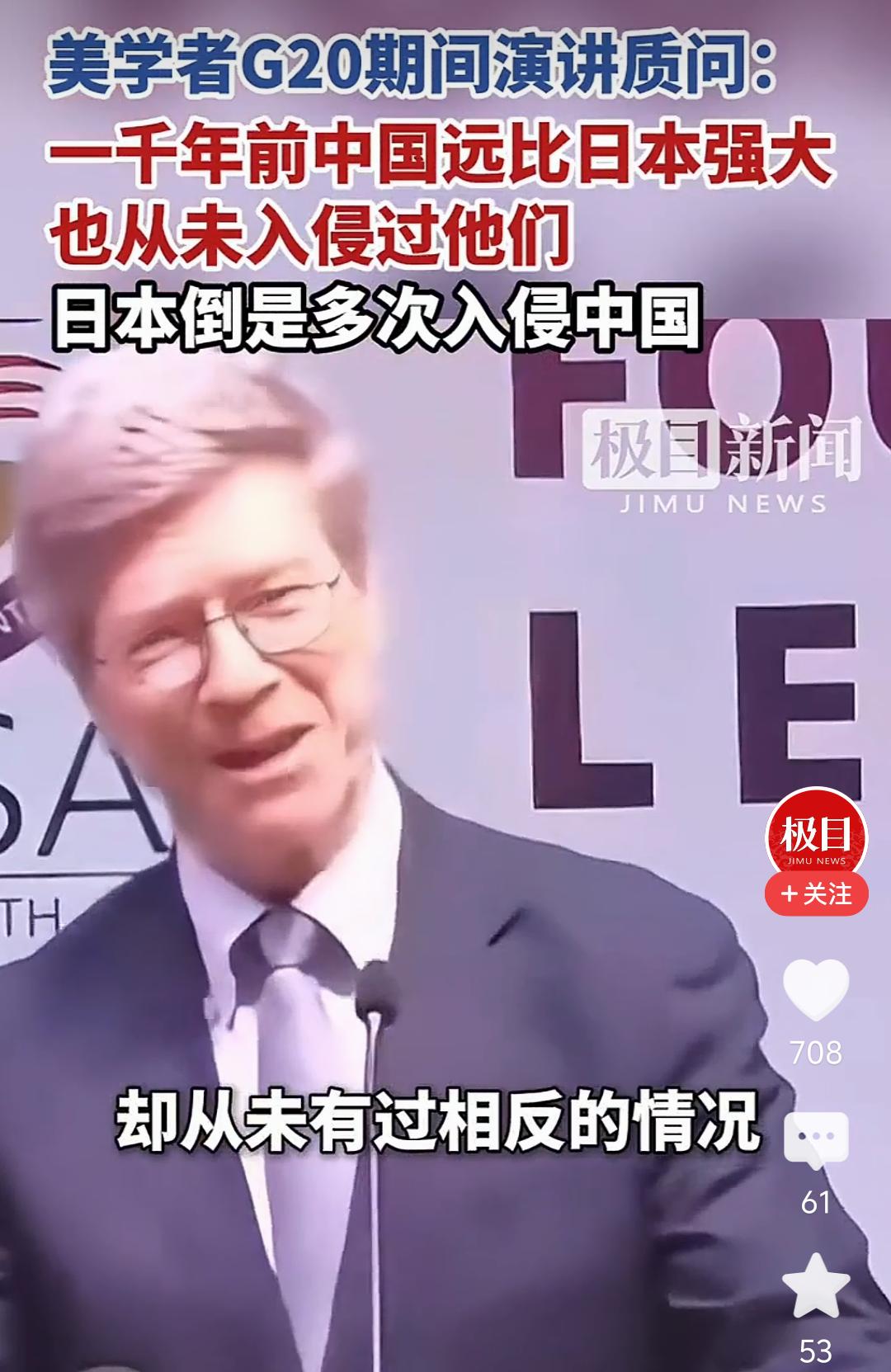 美国著名学者杰弗里·萨克斯在G20演讲时质问:“中国曾长达一千年,从未入侵过日本,尽管是近邻,且当时中国比它强大的多;遗憾的是,日本人倒是多次入侵中国,却从未有过相反的情况!” 简单说几句。 越来越多的外国人将关注到这一特殊的历史现象。 之所以说特殊,是这在历史上绝无仅有。 因为偶尔有弱国征战甚至是吞并强国,但如日本这样一千多年里总是入侵中国,历史上还未有第二个。 这一特殊的历史现象说明两个事实:一是中国是真正爱好和平的国家,二是日本自古以来就侵略成性。