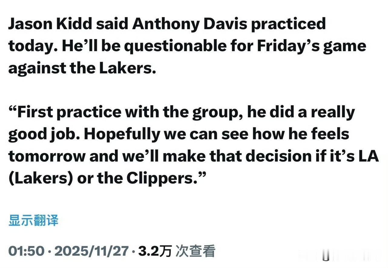 决定就在明天!!!浓眉可能在周六对阵湖人的比赛中复出! 根据记者Marc St