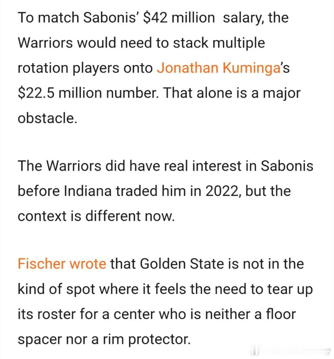 Jake Fischer:勇士实际不会参与争夺小萨博尼斯。2022年交易截止日期前,勇士步行者曾互相有意,勇士想要小萨,步行者对库明加感兴趣。今年,勇士与国王谈判中,勇士不愿放走希尔德或穆迪,且除了库明加外,需要更多筹码,另外,小萨的投射能力和篮下防守并不满足勇士的需求,尽管霍福德未达预期,但勇士还不至于拆队换小萨。