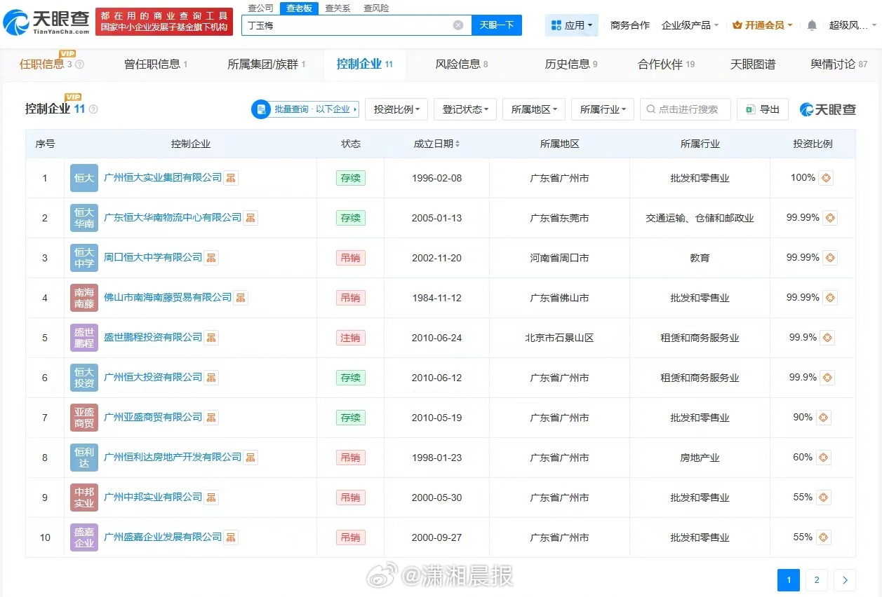 【#许家印前妻多家实控企业已被吊销#,#许家印前妻丁玉梅实控10余家企业#】#许家印前妻丁玉梅更多资产曝光#据媒体报道,11月26日,香港高等法院批准处于清算状态的中国恒大集团变更禁制令申请,允许其在泽西岛、直布罗陀、加拿大及新加坡四地,对许家印前妻丁玉梅提起司法程序,强制执行价值超2.2亿美元的境外资产。潇湘晨报记者天眼查任职信息发现,丁玉梅关联3家企业,其中2家为存续或开业状态,分别为广州创尔生物技术股份有限公司、广州恒大实业集团有限公司,丁玉梅在上述企业中担任法定代表人、董事长兼总经理。通过直接或间接持股,丁玉梅拥有10余家企业的实际控制权,其中多数已被吊销或注销。 广州