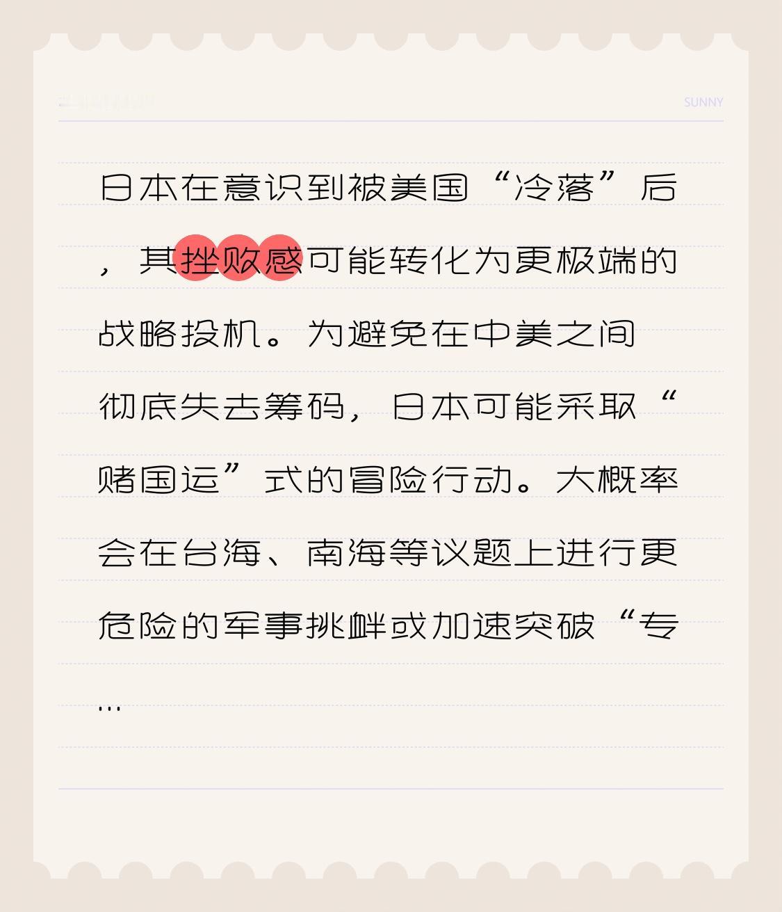 日本在意识到被美国“冷落”后,其挫败感可能转化为更极端的战略投机。为避免在中美之间彻底失去筹码,日本可能采取“赌国运”式的冒险行动。大概率会在台海、南海等议题上进行更危险的军事挑衅或加速突破“专守防卫”,实现事实上的国家正常化。这会将美国拖下水,主动制造一场危机来重新绑定美日同盟。
