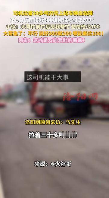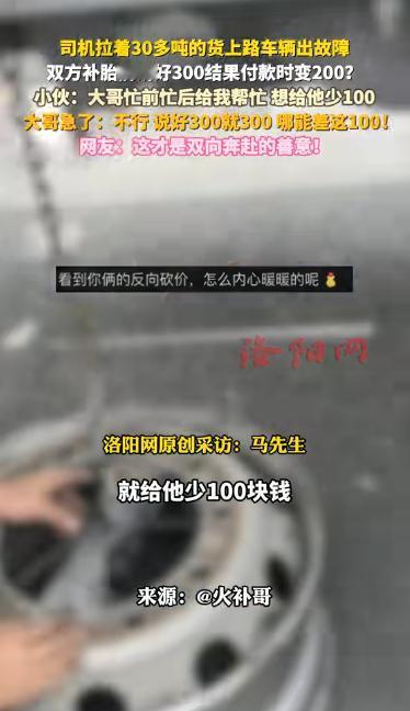 陕西,一位货车司机开车时发现爆胎,随后就联系了当地的一位维修师傅,两人提前说好了300块钱,可轮胎修好后,师傅却提出只要200,有意思的是,司机一听却不高兴了,坚持要给300块。网友:听过坐地涨价的,没听过坐地降价的   近日在乡间公路上的一件小事,最近在网上火了,有人说货车司机讲究,有人夸修胎师傅实在。   事情得从李大哥(化名)那天下午说起,他开着大货车在道路上正行驶了,没成想路过一段坑洼路,“砰” 的一声,后轮直接爆了。 当时风吹得车斗上的篷布哗啦响,李大哥掏出手机,联系了一名当地的维修师傅小王(化名)在电话里面两人说明了价钱,修一条胎三百块,小王在电话里说得干脆,李大哥悬着的心才算落了点。   等小王推着工具箱赶来的时候,李大哥没闲着,他已经把后斗门打开,三角警示牌摆到了几十米外,还找了块石头垫在车轮底下,李大哥递过去一瓶矿泉水,小王接过来拧开就喝,两人没多话,低头就忙活起来。 拆轮胎的时候,小王手上沾了不少泥,指甲缝里全是黑油,他得先把轮胎卸下来,抠掉嵌在纹路里的小石子,再一点点找扎破的洞,李大哥在旁边递扳手等等。 小王一边补胎一边念叨让李大哥以后再开车的时候注意一下,上车前就先检查轮胎等,避免出现这样的情况,李大哥在旁边应着。 四十多分钟过去,轮胎终于修好了,小王收拾工具的时候,突然停了下来,挠了挠头跟李大哥说,刚才他也帮了不少忙,省了我不少事,这钱就收两百元。   谁知道李大哥听完,脸色反倒有点严肃,他蹲下来帮小王把工具往箱子里归置,沉默了几秒才开口,说一开始说好的三百,就得按三百给,大老远跑来,手上全是油,这钱你该拿。   小王愣了一下,还想再说点啥,李大哥已经把三百元转了过来,小王这时候看着手机的屏幕心里有点不是滋味,说不上是感动还是不好意思,最后就只说了句让李大哥路上慢些。   这段视频被村民发到网上后,评论区一下子就热闹了,有人说李大哥讲信用,这年头能守住约定的人不多了,也有人觉得小王人好,懂得体谅别人的辛苦,主动降价很实在。   还有人说,在乡间小路上,做生意靠的就是这份互相体谅,你敬我一尺,我敬你一丈,比啥都强。   其实这事说大不大,说小不小,不过是公路上的一次爆胎,一次修胎,一次关于钱的争执,可就是这么件小事,让人看清了人与人之间最实在的相处之道,守约定不是死板,懂谦让也不是吃亏,关键是能站在对方的角度想一想。 对此,你还有什么看法呢?  (信息来源 :洛阳网 )