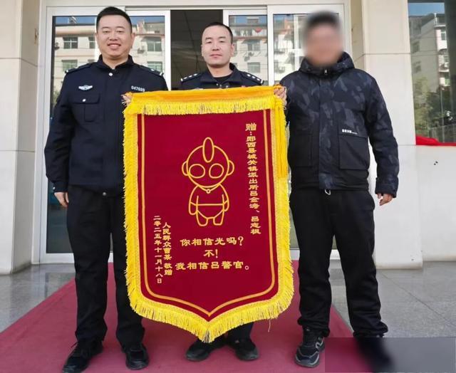 案件办结后,曹先生对民警高效破案的工作态度感激不已。为表达这份独特心意,11月21日,他专程将这面定制的“奥特曼”锦旗送到城关派出所。曹先生解释道:“奥特曼是正义和光的化身,总是在危难时刻挺身而出。吕警官帮我破案,就像一道光,驱散了不法行为带来的阴霾。我想用这种方式告诉他,我们相信吕警官带来的正义之光!”