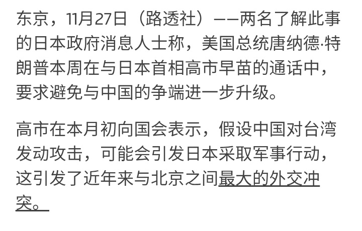11月27日,路透社报道:“据《华尔街日报》消息,特朗普本周与高市早苗通话时,呼