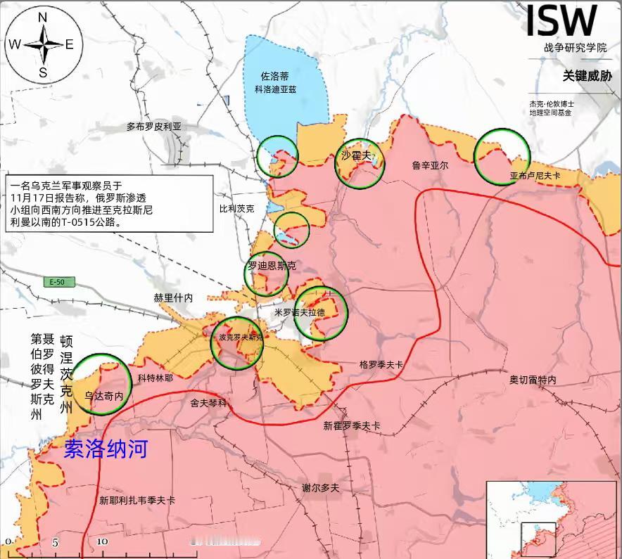 红军城战况更新:俄一心两用兵力被分散,乌侧翼反攻意在解围城 11月17日,俄军小股步兵已渗透至红军城以北的新沙霍夫、伊万尼夫卡地区,且在库切里夫亚尔以南持续活动。同时。俄军在城区周边多点发起进攻,涵盖西北方向赫雷申内、北面罗丁斯克、东北方向克拉斯尼利曼等多个区域,却未取得经证实的实质性进展。 目前,俄军将波克罗夫斯克—米尔诺赫拉德突出部列为核心目标,计划以钳形攻势完成合围。其作战部署呈现明显的“一心两用”特征:中部军区第2合成集团军从西南方向推进,南部军区第51合成集团军(原顿涅茨克人民共和国第1集团军)从东北方向包抄,南部军区第8合成集团军则以海军步兵部队策应助攻,形成三面围攻之势。 然而,俄军传统的多目标作战模式成效并不明显。第51合成集团军同时承担向波克罗夫斯克以北推进与压缩城区包围圈的双重任务,分散的兵力使其难以形成突破性攻势,下属第114、132摩托化步兵旅被迫在扎波维德内—伊万尼夫卡、马亚克—新沙霍夫等多条战线作战。 西南方向的第2合成集团军同样面临兵力分散的困境。该集团军在乌达赫内、科特林内地区的进攻行动,既要承担封闭西侧包围圈的任务,又试图向波克罗夫斯克城区及北部渗透,导致推进动能不足。尽管其10月下旬快速突入城区,但始终无法完全控制局势,城内“无明确前线”的巷战状态持续至今。战争研究所评估指出,俄军虽在兵力规模上占据优势,但伤已导致第51、第2合成集团军部分部队战力削弱。 为弥补兵力密度不足,俄军尝试利用大雾天气抑制乌军无人机活动,通过车辆运送部队强化城区攻势,并专门清理T-0504、O0544号公路,为增援米尔诺赫拉德的部队开辟通道。同时,俄军投入大量无人机部队参战,第51合成集团军第56独立特种作战营、第8合成集团军第68独立侦察营等单位的无人机操作员,分别在城区及多布罗皮利亚周边实施精准打击。但小股步兵渗透战术未能有效肃清波克罗夫斯克城内乌军,反而使部分俄军小分队陷入乌军“亚战术级包围”,难以形成有效协同。 针对俄军兵力分散的弱点,乌军将反攻重点锁定在多布罗皮利亚突出部根部,从东西两侧发起钳形反击,意图切断俄军合围兵力的后路。乌克兰军事观察员马绍韦茨证实,乌军反攻已迫使俄军转入防御,第51合成集团军不得不抽调主力抵御,显著缓解了波克罗夫斯克城区的防守压力。 在具体战场行动中,乌军形成多点反击态势。11月16日至17日,乌军在沙霍夫附近发起针对性反攻,牵制俄军在多布罗皮利亚东部的进攻动能;波克罗夫斯克城区内,乌军坚守北部阵地及顿涅茨卡铁路以南区域,持续打击俄军渗透部队,11月16日的地理定位视频显示,乌军正对城区北部被占建筑实施精准打击。与此同时,乌军第一亚速军等精锐部队在多布罗皮利亚方向取得关键进展,解放库切里夫亚尔等村庄,72小时内造成俄军千余人伤亡,迫使俄军更换第51集团军及下属第132旅指挥官。 乌军的反攻作战得到精准战术配合。其利用俄军战线分散的漏洞,集中力量打击突出部薄弱环节,同时以无人机部队持续压制俄军补给线。在作战序列运用上,乌军整合特种部队与常规兵力,针对俄军无人机威胁制定反制策略,有效遏制了俄军的渗透攻势。俄方军事博主承认,乌军在赫雷申内、里夫内、米尔诺赫拉德等多个方向的反击,已打乱俄军既定作战节奏。