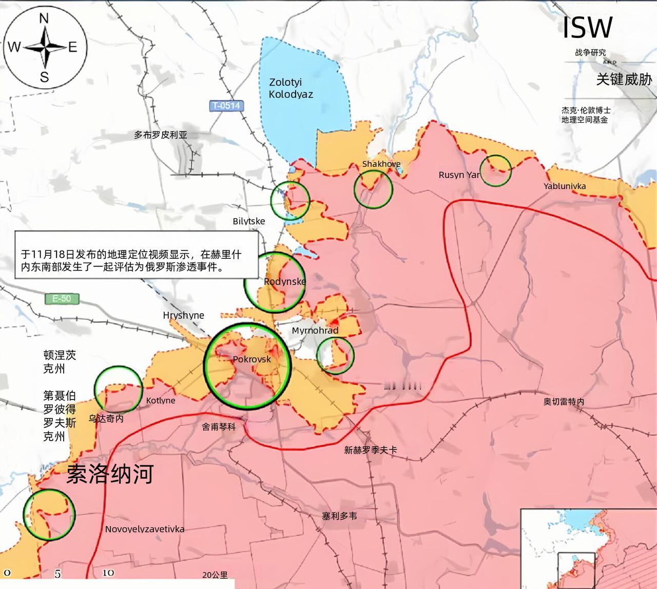 战况更新:红军城陷落在所难免,乌军犹在顽强阻击 11 月 19日俄军继续扩大进攻正面。在城区周边,俄军同时向西北部赫里申内、北部罗丁斯克、东北部切尔沃尼利曼、东部里夫内及南部新帕夫利夫卡等多个方向发动牵制性进攻;在侧翼的多布罗皮利亚以东区域,俄军则重点突击沙霍夫、新沙霍夫及潘基夫卡等地,试图开辟新的突破点。俄军事博主声称俄军在托列茨凯西南部及沙霍夫中部取得进展,但此类说法尚未得到独立证实。 11 月 18 日的地理定位视频显示,乌军在波克罗夫斯克以北击毙一名俄军士兵,ISW 评估这表明俄军已渗透至该地区。11月19日,另一段视频显示乌军在西北郊 O0525 公路沿线击溃另一处俄军渗透区域。目前尚无法核实俄军渗透部队的具体行进路线,但这种高频次试探正持续消耗乌军防御精力。 11 月 19 日发布的视频显示,俄军疑似使用 FAB-3000 重型滑翔炸弹袭击米尔诺赫拉德 —— 这款加装 UMPK 制导套件的 3 吨级炸弹,可在百公里外精准命中目标,爆炸半径超 50 米,能有效摧毁乌军坚固工事。在无人机作战领域,隶属于俄军第 51 合成集团军第 56 独立特种作战营的 FPV 无人机操作员,正持续在城区周边打击乌军车辆,而第 20 摩托化步兵师第 68 独立侦察营的巡飞弹则重点袭击扎特什奥克与扎波维德内的乌军仓库与人员集结点。 针对俄军的多点进攻,乌军也发起局部反击,俄国防部及军事博主均确认,乌军在米尔诺赫拉德、赫里申内、罗丁斯克等方向实施了反冲击行动,尤其在新沙霍夫附近的反攻一度迫使俄军调整进攻部署。 11 月 19 日,乌军前线某旅发言人表示,乌军通过精准打击与障碍布设,已基本切断俄军向城区输送物资的机械化通道,迫使俄军不得不以两至三名士兵为一组,采用徒步方式冒险运送补给。 11 月 10 日至 11 日,俄军曾借助浓雾掩护,试图通过 M-30 波克罗夫斯克 — 塞利多夫高速公路从南部实施机械化补给,此举起初获得俄方军事博主的普遍看好。但随后流出的战场视频显示,俄军车队进入城区边缘即暴露在乌军炮火覆盖下。 据前线乌军无人机营指挥官披露,乌军已在俄军反复试图输送重型装备的关键道路上密集布设地雷,导致俄军装甲车辆几乎不敢进入城区作战区域。这种 "炸线 + 布雷 + 炮火" 的立体封锁模式,有效阻碍了俄军依赖装甲优势的传统进攻战术。 乌军无人机营指挥官表示,尽管俄军尚未在城区建立稳固防线,但其围绕波克罗夫斯克构建的 15 至 20 公里 "杀伤区" 已对乌军构成严重制约 —— 这片无人机与战术打击密集覆盖的区域,使乌军后勤车辆与增援部队的机动面临极高风险,显著增加了防御维系的难度。