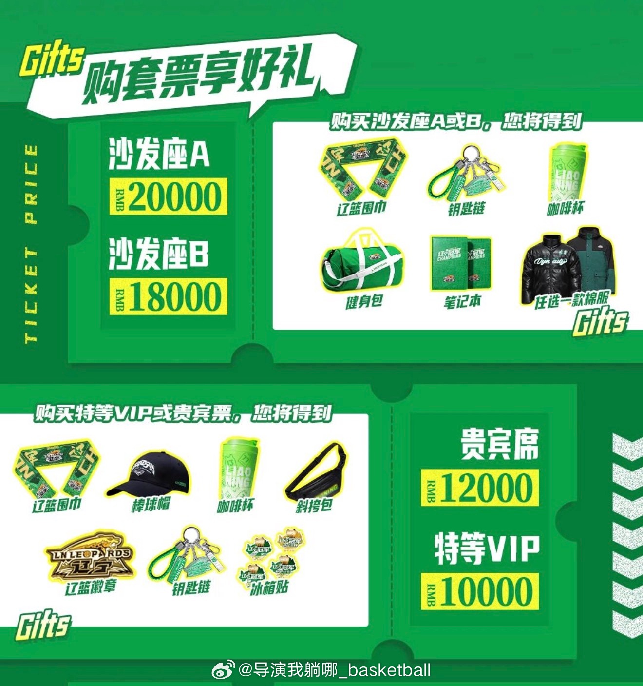 辽宁男篮新赛季赛季套票价格公布:最低丙票1000元,内场最高一个赛季20000元,今年套票持有者将有礼品赠送