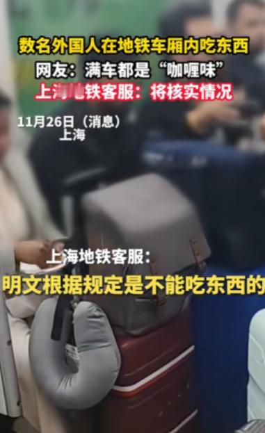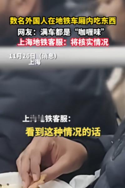 滚回自己的国家!近日,上海,地铁上出现一群外籍人士,他们竟然在车厢内拿着盘子吃起了手抓咖喱饭!周围的空气瞬间弥漫着难闻的味道,旁边的乘客只能捂紧自己的口鼻,不满地看着他们。网友:太没素质了!   近日在上海地铁正是晚高峰的时候,车厢里挤得满满当当,张先生(化名)刚下班,好不容易在人群里找到个能扶的地方,突然一股又刺鼻又油腻的味道飘过来,直冲鼻腔。   他皱着眉抬头找来源,这一看,差点没忍住皱眉,三个外籍年轻人围着一个白色塑料盘,正用手抓着裹满黄咖喱的米饭往嘴里送,盘子旁边堆着好几张沾了油渍的纸巾,其中一个人吃完,还直接用沾着咖喱的手指蹭了蹭裤子,吃得一脸满足。   车厢壁上明明贴着不允许吃任何食物的标识,就在他们头顶不远的地方,可这几个人像是没看见一样。   张先生后来在网上说,当时车厢里的气氛特别尴尬,旁边有个姑娘皱着眉,使劲往窗边靠,尽量离那几个人远一点,还有个抱着孩子的妈妈,怕味道呛着孩子,抱着孩子挤到另一节车厢去了。   更让人揪心的是,其中穿黑色卫衣的青年,抬手的时候没注意,盘子里的咖喱汁差点洒在扶手上,周围好几个人都下意识地缩回手,生怕沾到身上。   有人忍不住咳嗽了两声,其中一名年轻人抬头看了一眼之后,满不在乎的接着低头继续吃,完全没把别人的反应当回事。   很多网友看了之后纷纷评论留言,大部分人都在批评这几个外籍青年,说 “好好的地铁车厢,愣是被当成了餐厅”“自己吃得开心,完全不管别人舒不舒服”。   还有人说,他平时在地铁上连喝水都特别小心,生怕洒出来影响别人,对比之下,这种徒手抓咖喱饭的行为也太不尊重人了。   后来上海地铁客服也回应了这事,明确说车厢里一律禁止饮食,这么规定就是为了保障大家的乘车体验,要是遇到类似情况,乘客可以及时跟车站工作人员说,或者打热线电话,他们会核实处理。   其实仔细想想,不管是本地人还是外国人,在这样的公共区域都得考虑别人的感受,地铁是大家共用的交通工具,一个人的不注意,可能会让一车厢的人都不舒服。 对此,你还有什么看法呢?  (信息来源 :潇湘晨报.晨视频 )