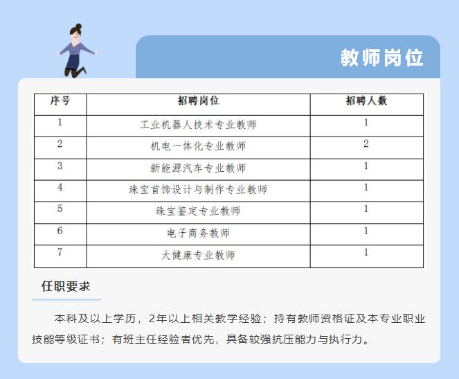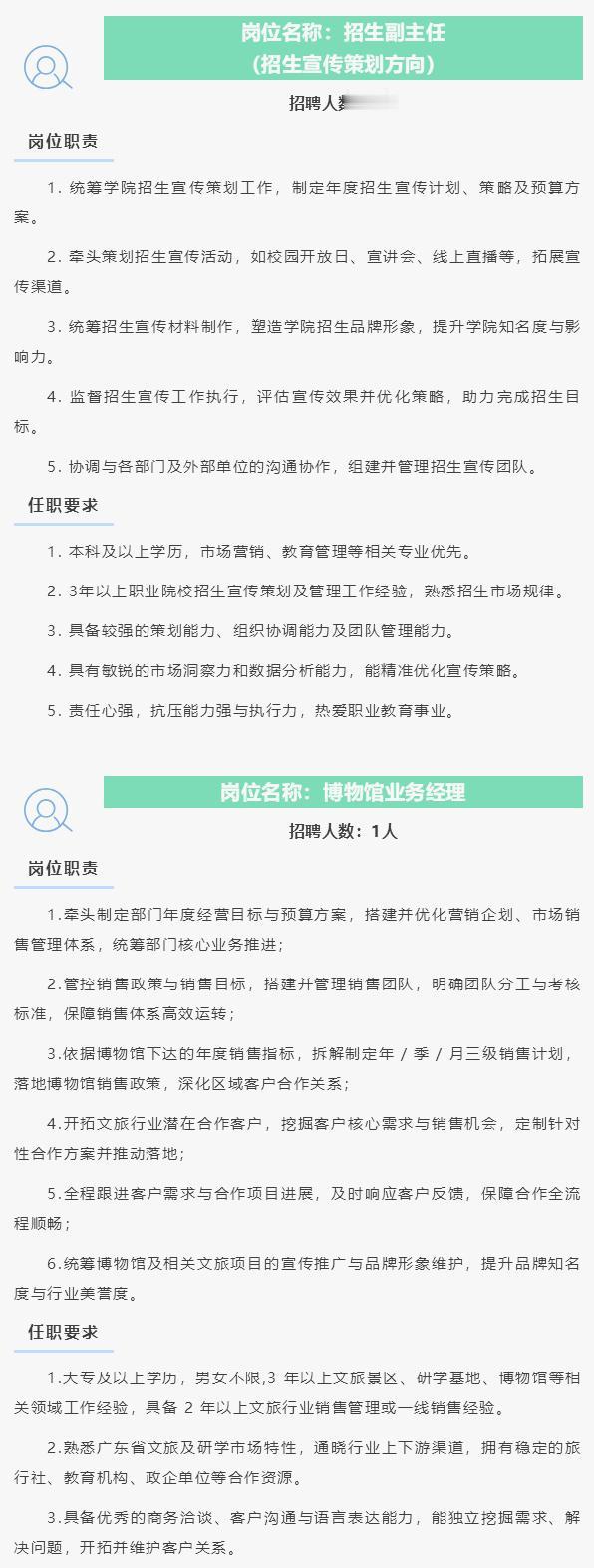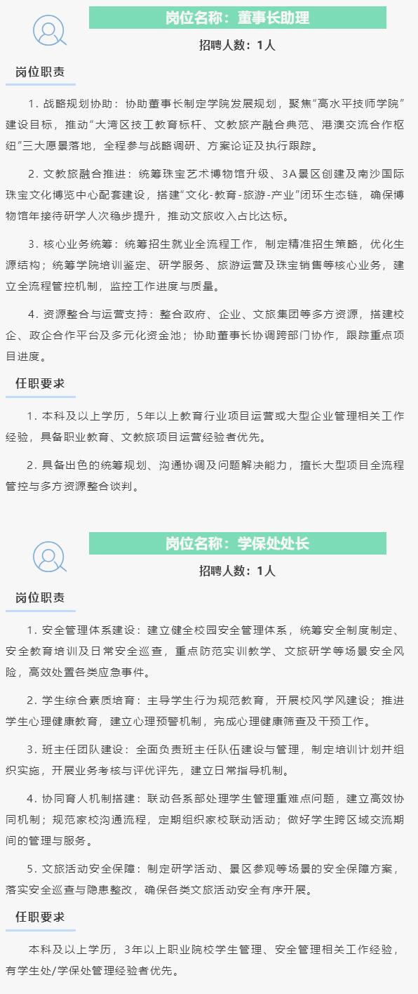 【南沙好工作】位于南沙庆盛的广州南华工贸技师学院开启新一轮招聘。岗位十分丰富,其中管理岗位包括董事长助理、学保处处长、综合办公室主任、财务副处长、招生副主任、博物馆业务经理等。而行政与教学辅助岗位则包括有专职班主任、校企合作干事、招生业务老师、招生接待员等。另外还有多个职位的教师岗位招聘。 符合条件的可以去投简历哦,福利都十分不错的。