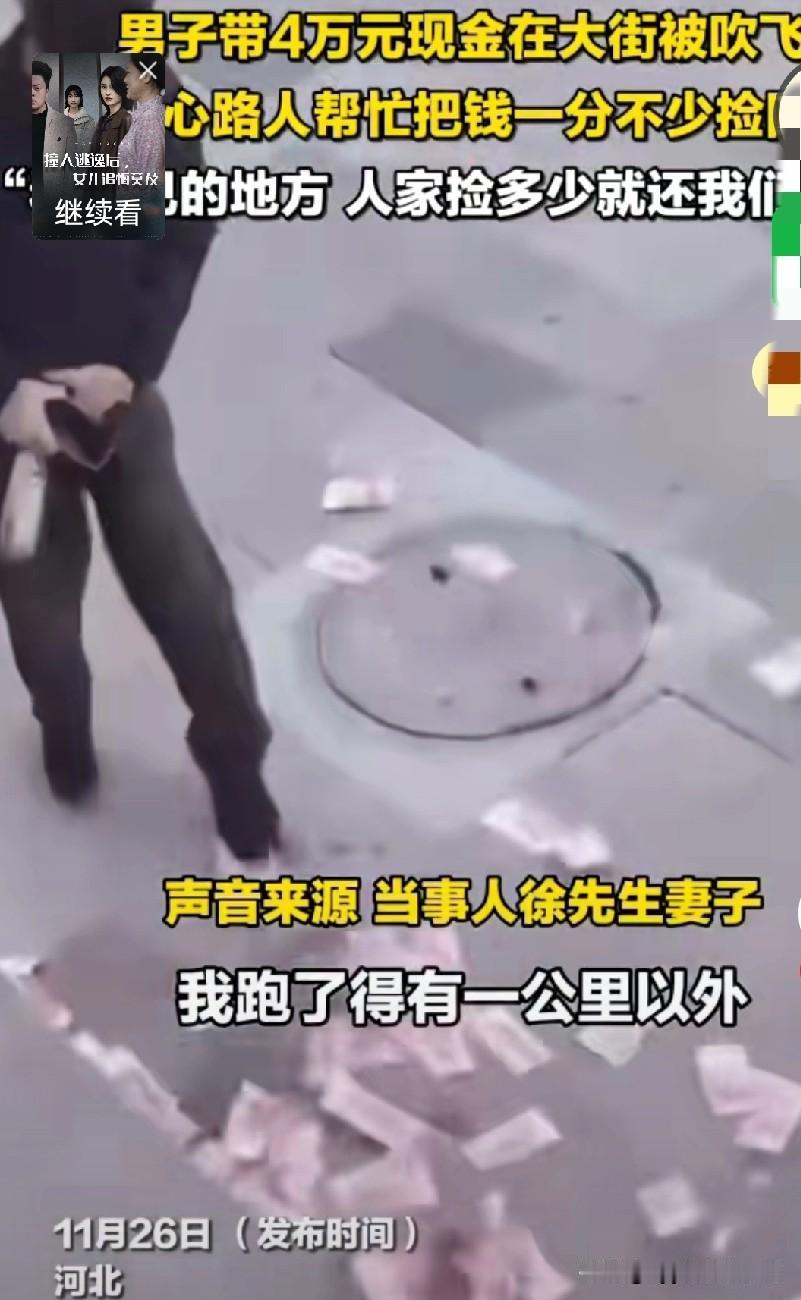 一男子,衣服兜里揣了五万块钱的现金!当他和妻子,走到大街上的时候,他兜里的现金突然滑了出来…… 还没等他反应过来,一阵调皮的大风就放马过来了!妻子反应还挺快,她赶紧蹲下身,去和大风抗争!结果,手忙脚乱中,她还是抢回来的少,被吹走的多! 男子呆愣了一会,才后知后觉的去保护自己的钱!但此时,英雄也是无用武之地啊!他们不得不,一边狼狈的追着风跑,一边又毫无形象的,把抢回来的钱往兜里塞! 这时,路边的行人也看到了路面上,和大风私奔的钞票!于是,他们也赶紧加入了,这个围追堵截的大军!这一追就是,五百多米啊! 在大家坚持不懈的努力下,这些私奔的钱终于都被逮了回来!夫妻俩,对他们也是千恩万谢啊!要不是有他们的帮助,自己的损失就大了! 男子的妻子,激动地说:“我们看不到的地方,他们捡了多少就还回了多少,一分钱都没丢!”阳光总在风雨后,它能照到的地方都充满了,光明和温暖啊!