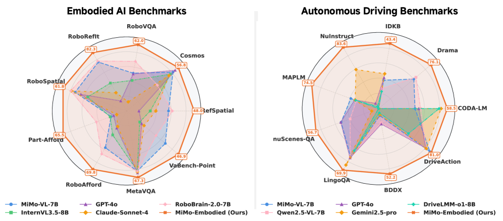 小米做了一个研究,尝试全面打通机器人和自动驾驶界限,统一训练模型应用两大场景的工作小米具身基础模型 MiMo-Embodied,牵头人是小米辅助驾驶的 VLA 负责人陈龙。这个研究验证了一个核心假设:物理世界的智能是通用的。长期以来,学术界和工业界都倾向于将「室内机器人操作」和「室外汽车自动驾驶」作为两个独立的垂直领域。机器人是室内抓取,空间感知、动作交互,比如拿起一双筷子。而汽车是户外动态环境,观察交通,预测行人轨迹,很少能有一个模型兼顾这两种差异极大的应用场景。而 MiMo-Embodied 尝试打破这种割裂,构建一个跨域的基础模型。MiMo-Embodied 的模型架构包括一个视觉 Transformer、一个 MLP 把视觉特征和大语言模型映射对齐、一个大语言模型负责推理。在数据集这块也做了很精细的策略。不是简单把机器人和自动驾驶数据集混合,而是分阶段、系统化的去调。第一阶段是机器人数据,先让模型有了机器人模型的能力第二阶段是自动驾驶数据,让模型学会开车第三阶段是 COT 思维链的数据,让模型无论在室内还是室外,遇到复杂场景可以一步一步连贯推理。第四阶段用强化学习微调之类的技术,进一步对齐模型的操作偏好和人类的驾驶习惯,属于最后的优化了。训练的结果是,MiMo-Embodied 在机器人和自动驾驶两大领域的多个评估中拿下了最优表现。这验证了MiMo-Embodied 的模型能力是完全通用的,跨域训练没有出现性能摇摆的问题,物理 AI 的能力是泛化的。如果按照这个研究结果来一个 Ilya 式的延伸,那么逻辑上 AI 眼镜、无人机、扫地机器人、人形机器人、自动驾驶汽车,背后可能可以是同一个机器人模型,当然这是很远期的畅想。从业界看,今年 6 月特斯拉 Optimus 机器人 AI 负责人 Milan kovac 离职后,FSD 负责人 Ashok 就在尝试以统一的架构来管理机器人模型和世界模型,Elon Musk 后来的评论也证实了这一点。当然了,小米这个 MiMo-Embodied 只是一个研究,要量产落地还需要大规模的工程工作,这也是为什么小米直接开源了代码、模型和数据集,如果是服务于量产的有商业价值的,小米肯定没法这么慷慨了。