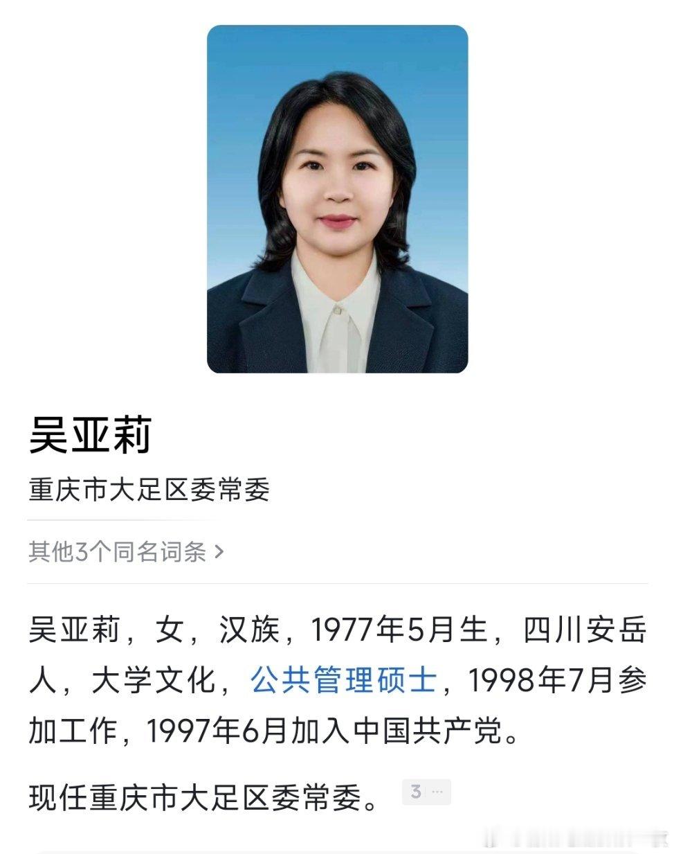 原江北区副区长吴亚莉已任大足区委常委。热点现场