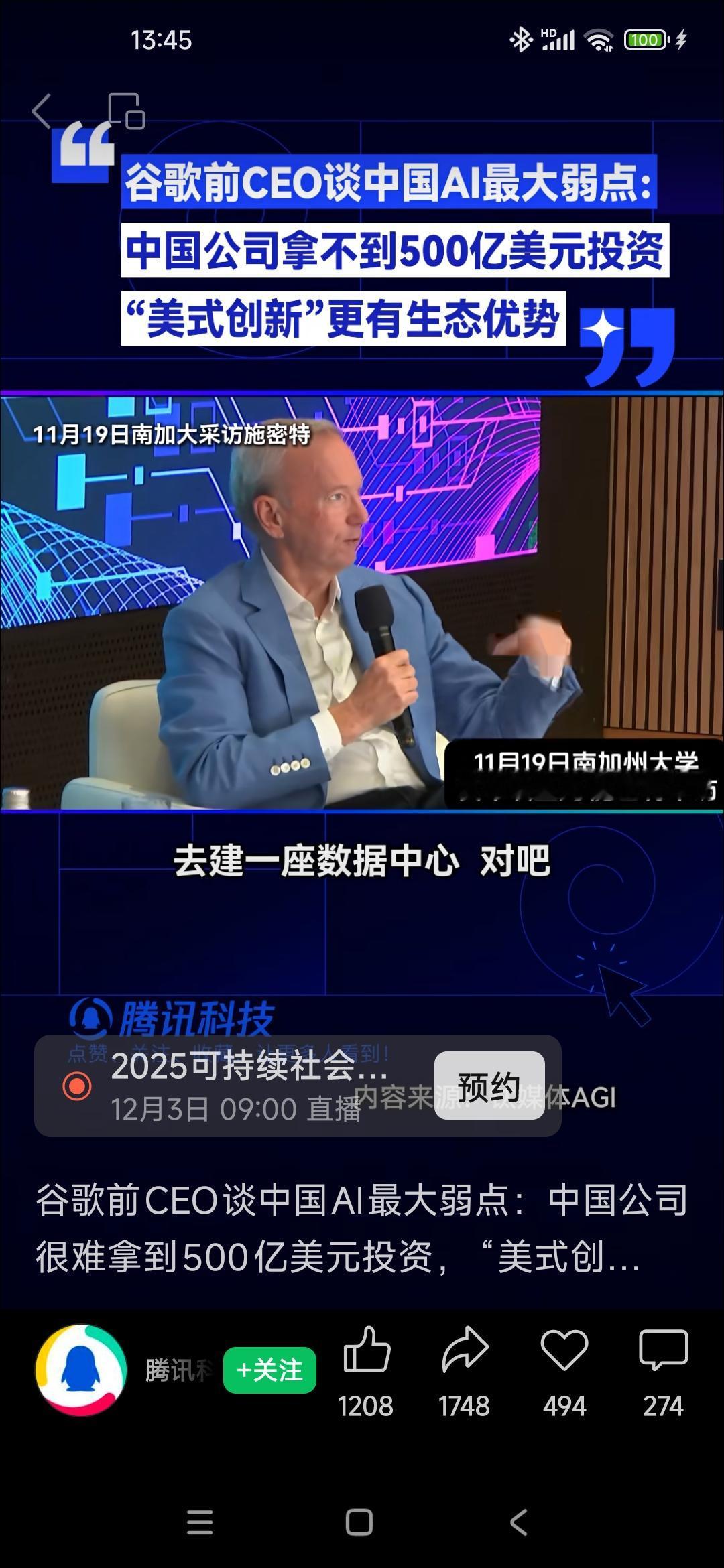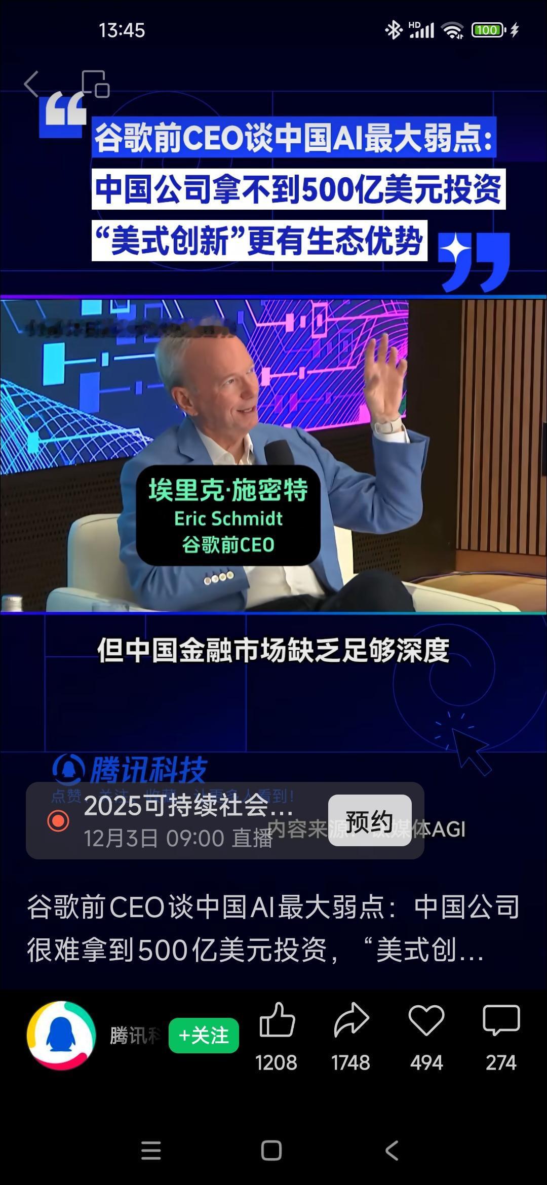 "谷歌前CEO谈中国AI最大缺点" 我原以为中国会在AI领域尝试超越我们。 但中国金融市场缺乏足够深度,来资助本国企业做这些疯狂的项目。 你不可能在中国筹资500亿美元,去建一座数据中心。 所有证据都表明,一切的创新,尤其是像美国一样的创新,是构成美国"例外论"的关键因素。 而其它也是民主制的国家,却没有任何增长。 编者: 大家怎么看呢? 我觉得可以让我们拭目以待。