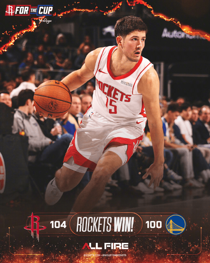 虎扑11月27日讯NBA杯小组赛,火箭104-100战胜勇士。
