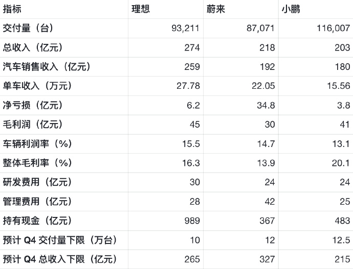 蔚来小鹏理想三家的Q3财报数据对比 理想依然是收入最多的,单车收入最高的,车辆利润率最高、毛利润最多的,也是研发费用最多的,目前持有现金最多的; 小鹏是交付最多的、毛利率最高的、管理费用最少、亏得最少的; Q4 蔚来会是收入最多的,没想到吧?